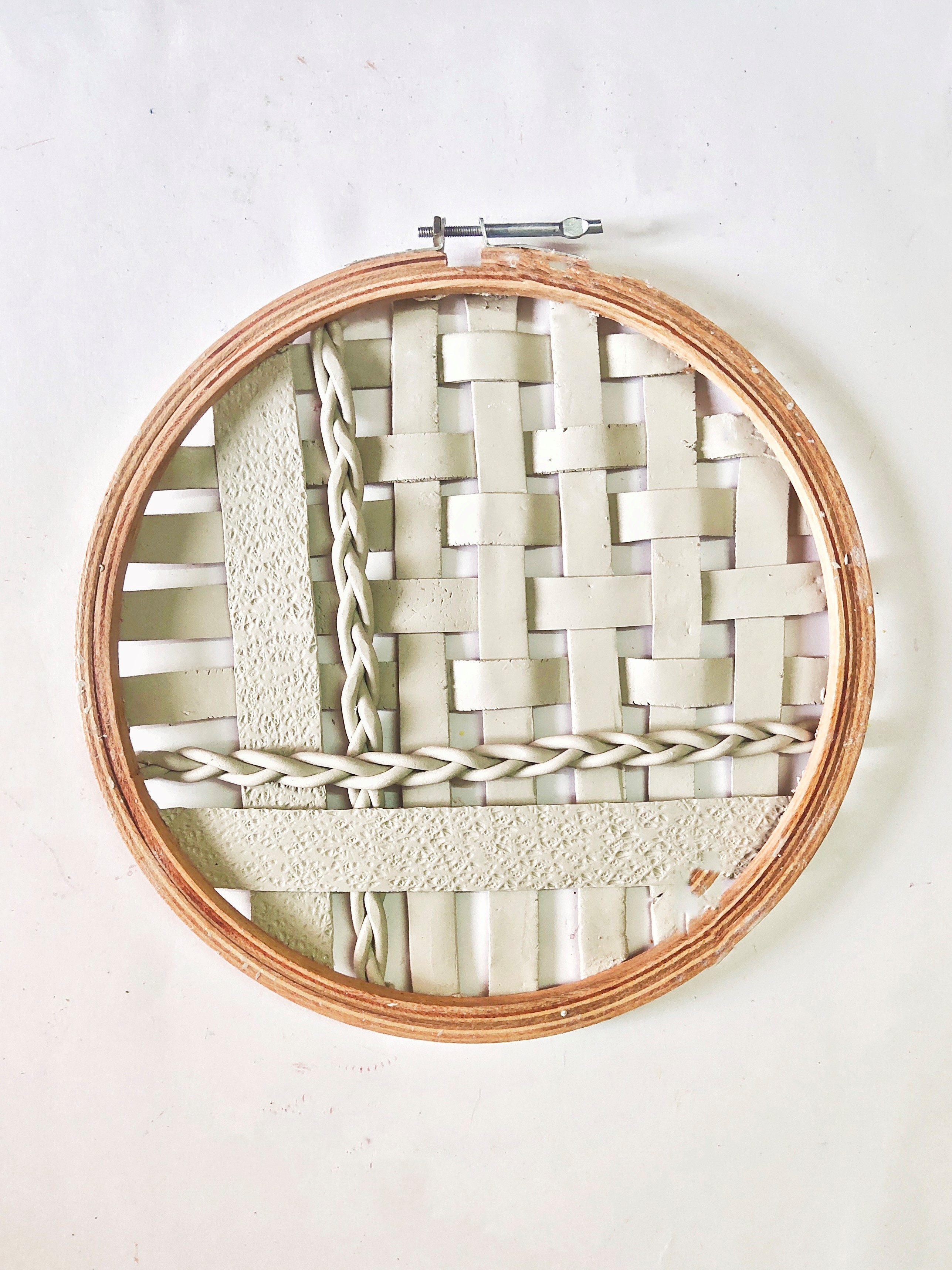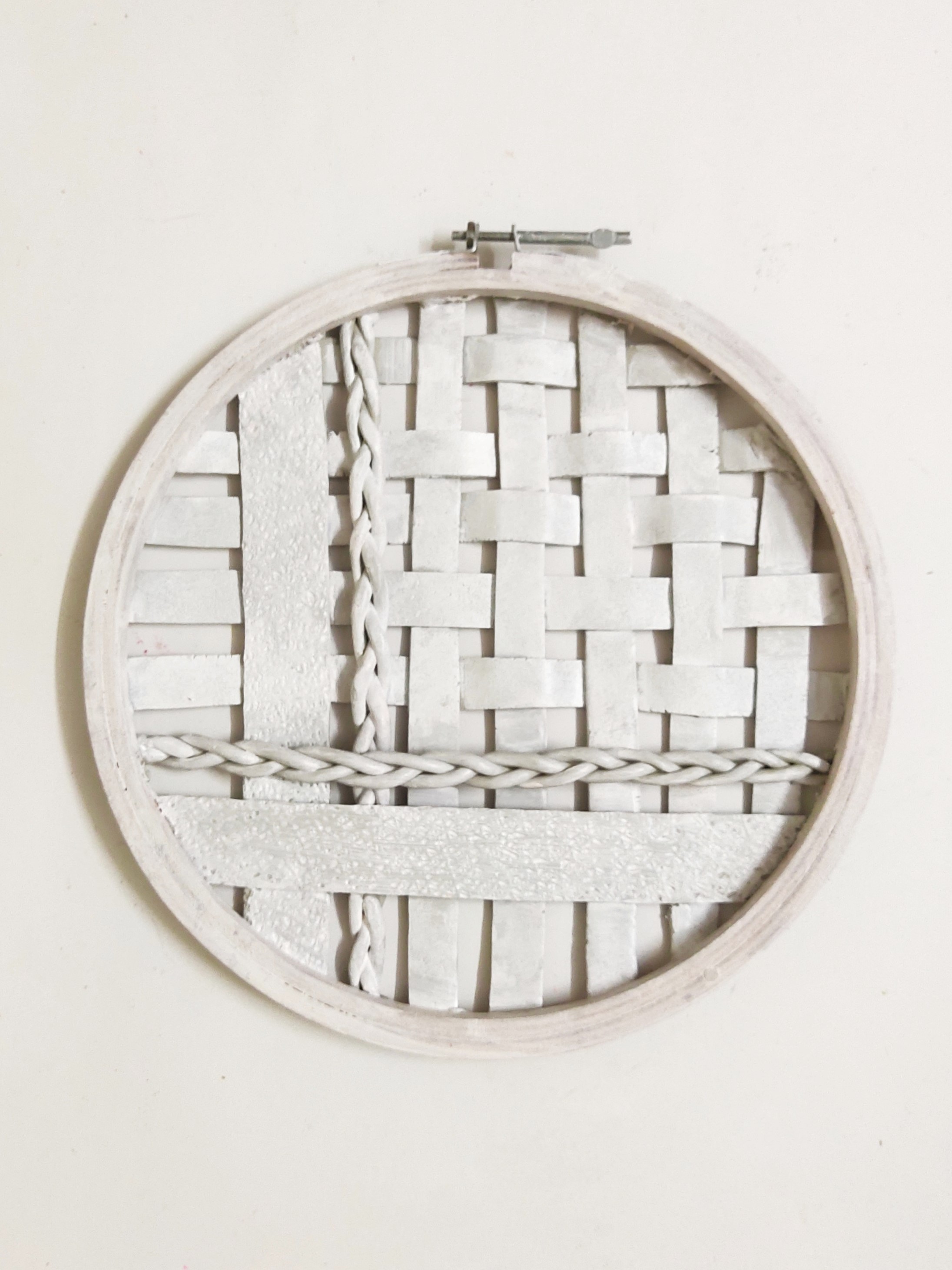 Take the embroidery ring and stick the strips and the plaited coils from the rear of the ring using Fabric Glue.