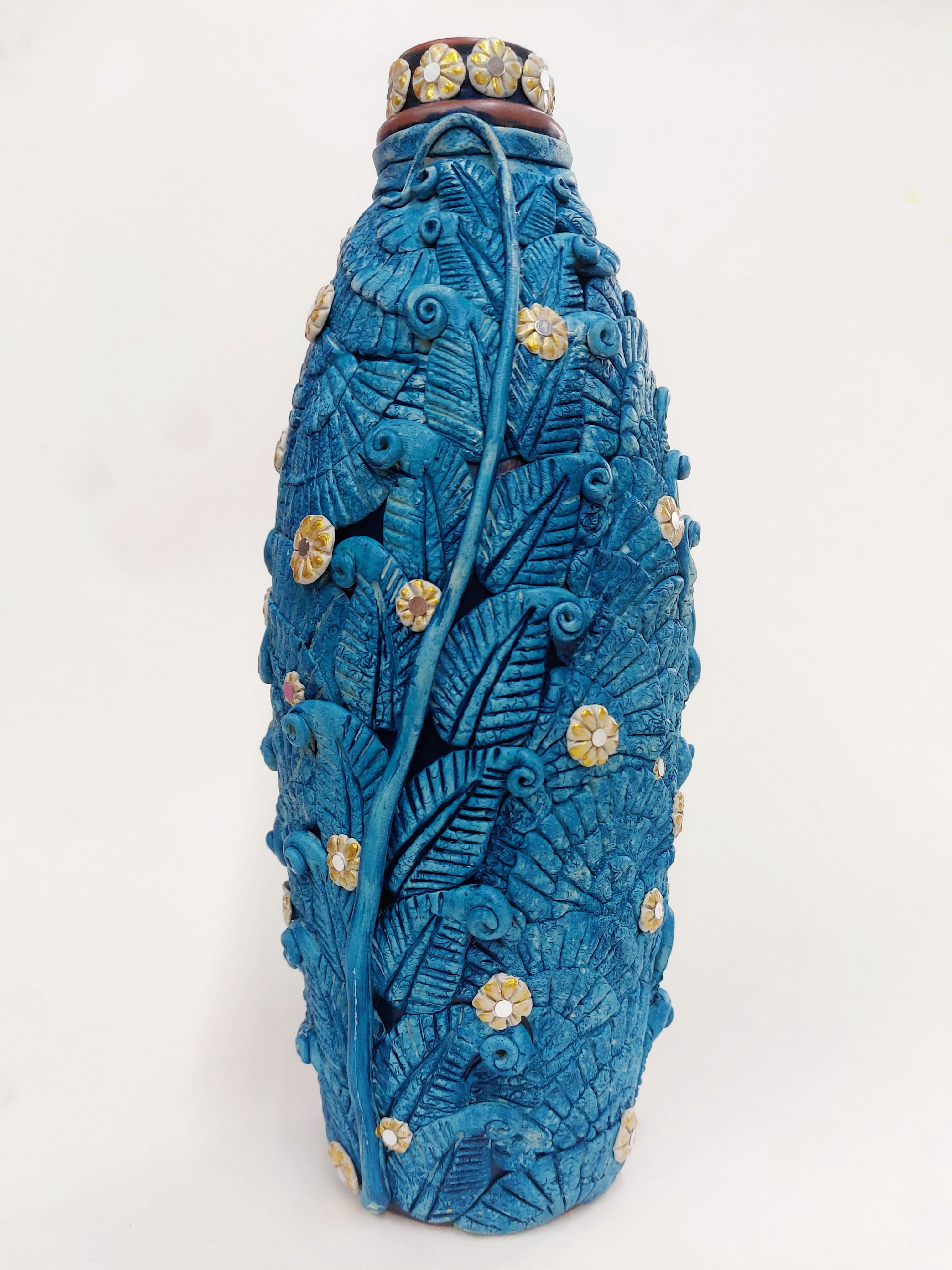 Fevicryl Acrylic Colours Turquoise Blue 22, Fevicryl 3D Outliner- Antique Gold 356, Fevicryl Mouldit, Fevicryl Fabric Glue, Fine Art Brushes, Terracotta Bottle Vase, Silver Sequins/ Small Foil Mirrors, Clay Modeling, Pencil, Paper Cutter, Colour Palette, Water Container