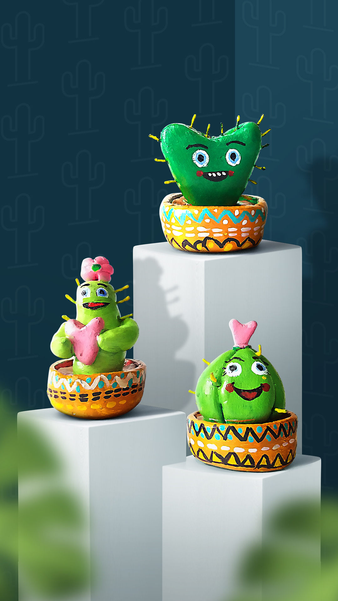 - Decorate and paint the planter, the facial expressions of the cactus with Acrylic Colours Black 02, Chrome Yellow 03, Crimson 04, Ultramarine Blue 23, White 27 and Teal Blue 68