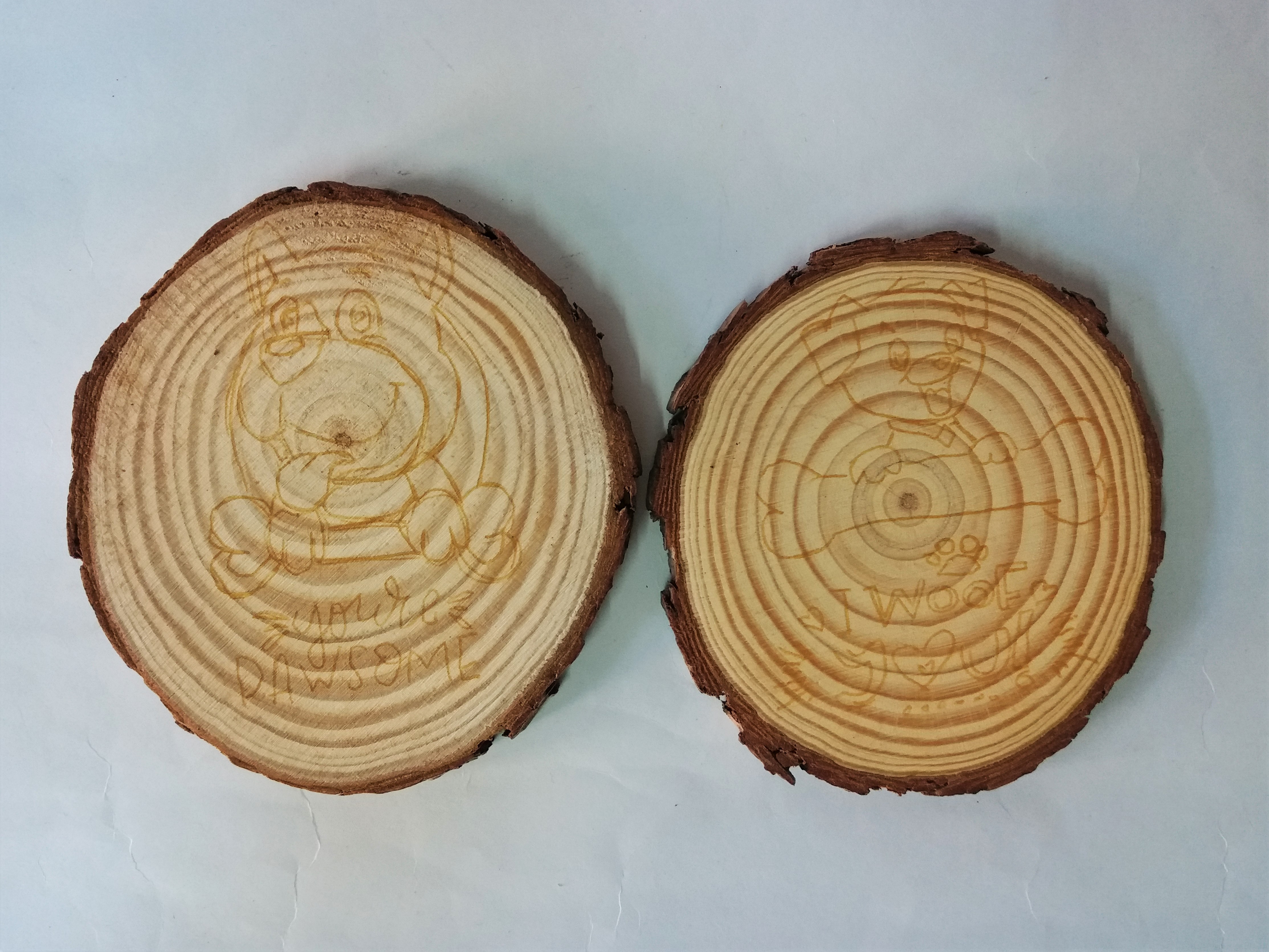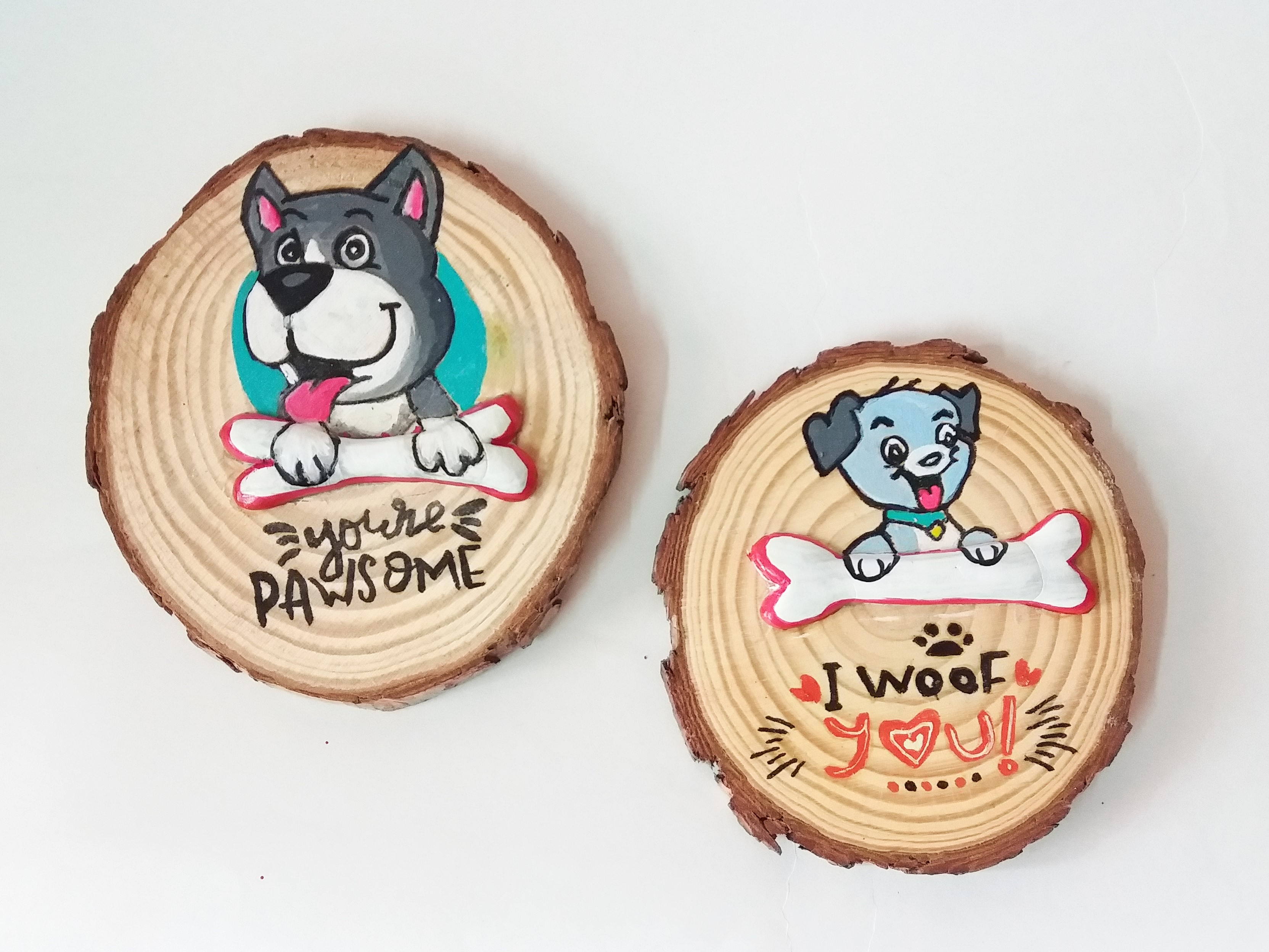 - Take A4 white paper, draw the face of the dog and bone with the quotes like ‘ You are Pawsome’ and ‘I Woof You’ in the size of the wooden slice on it.