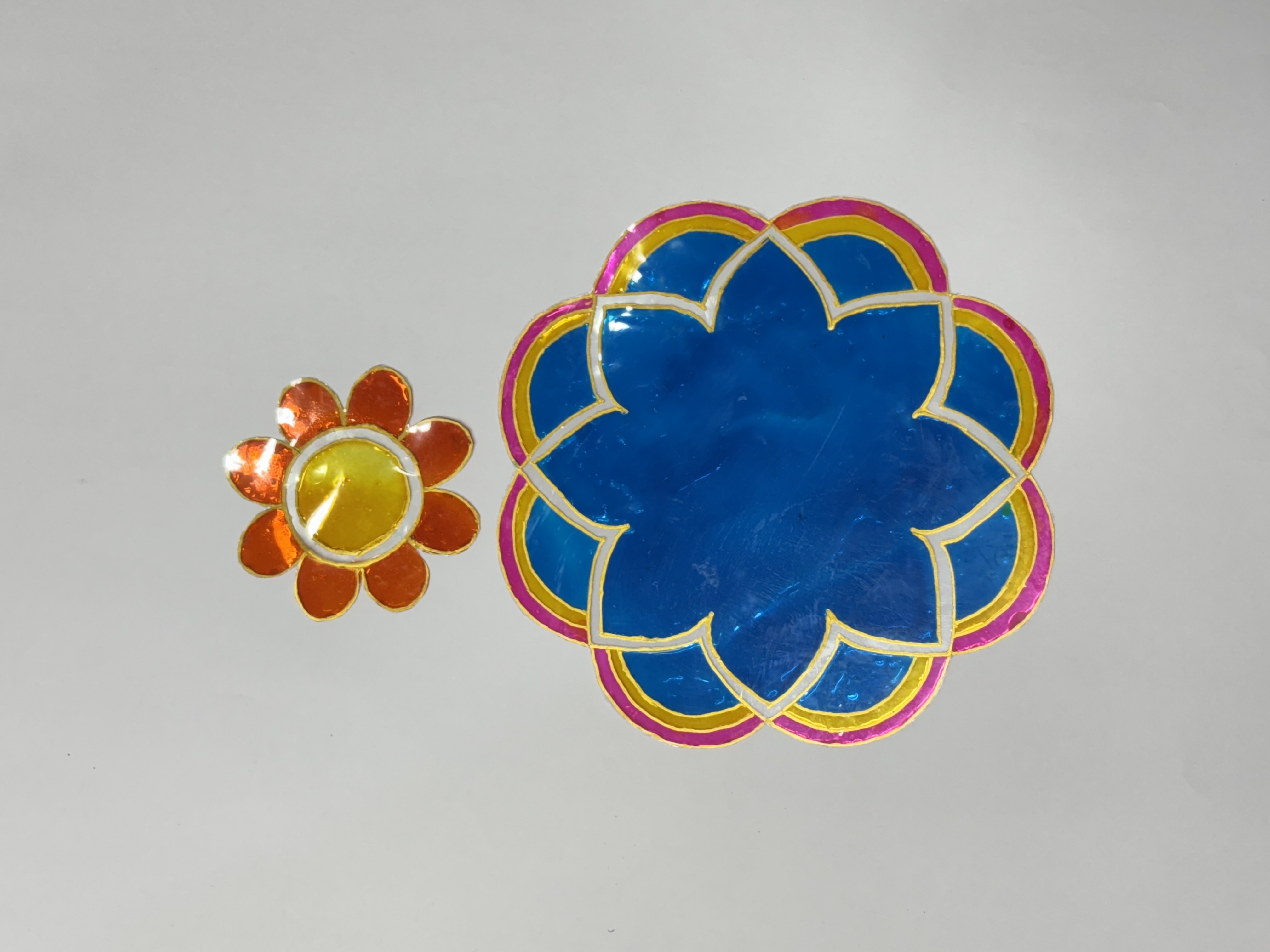 - After all the colours have dried completely, use scissors to carefully cut out the different shapes of your rangoli design.