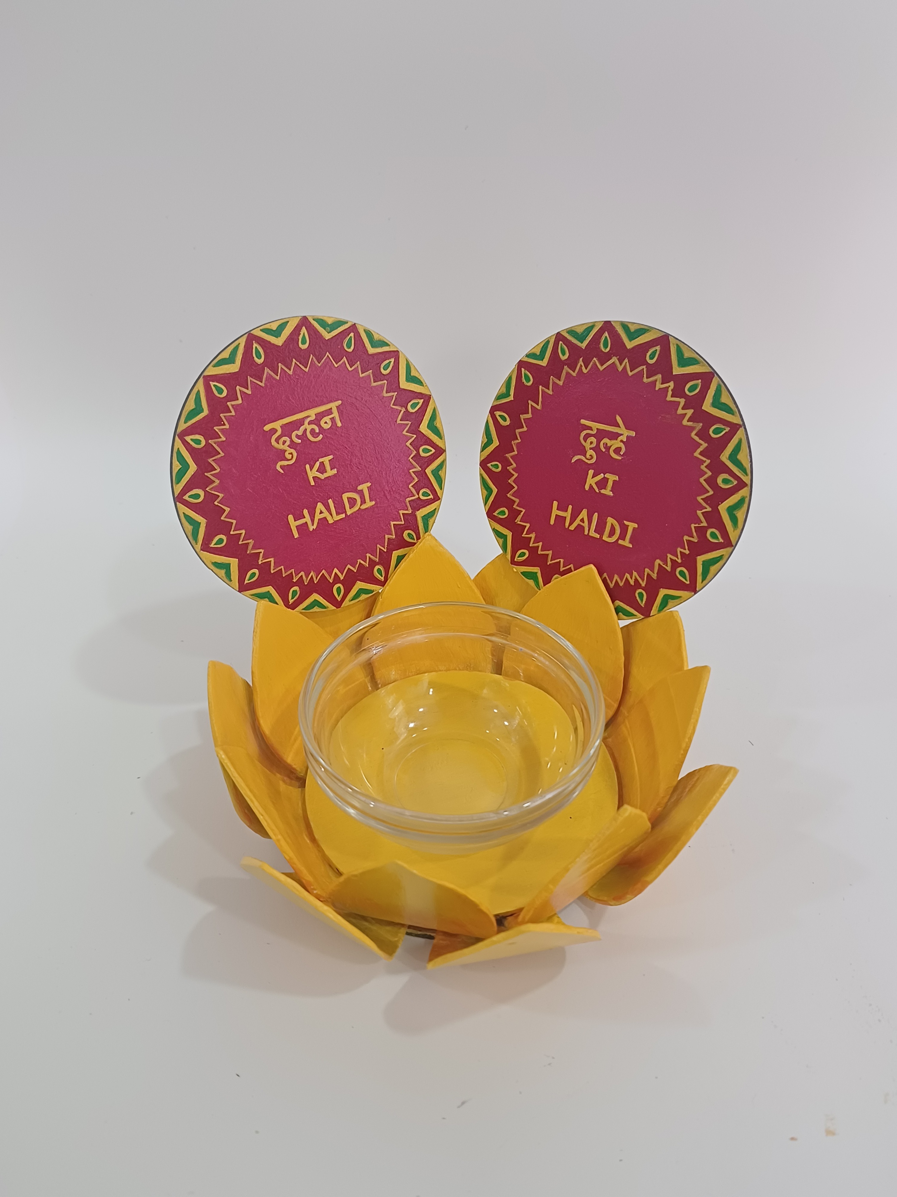 - Your beautiful, handmade lotus tray is now ready for the Haldi function, serving as a stunning centerpiece!