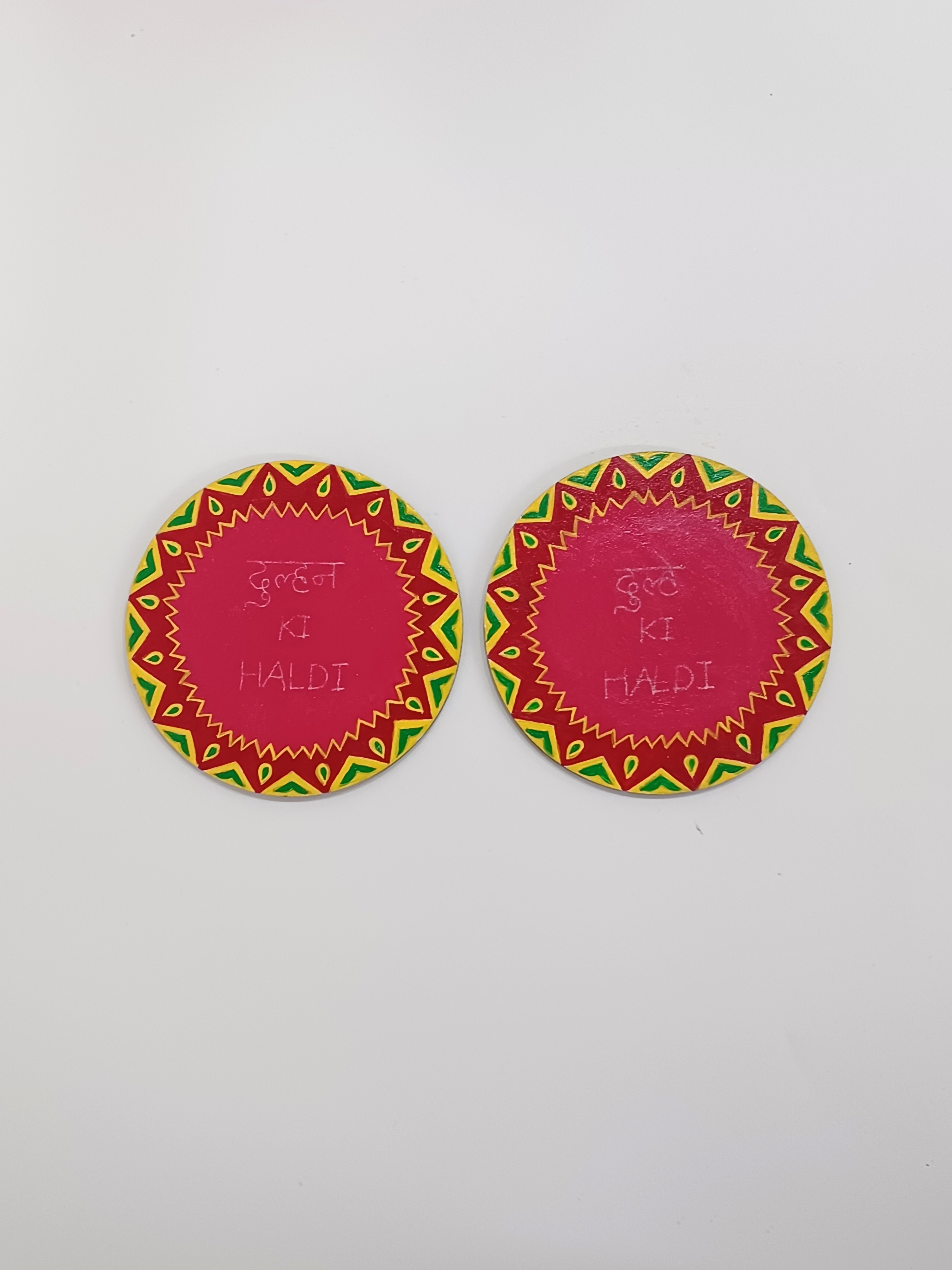 - Pick Fevicryl Acrylic Colour Red and Yellow to paint the design on the mini MDF coaster.