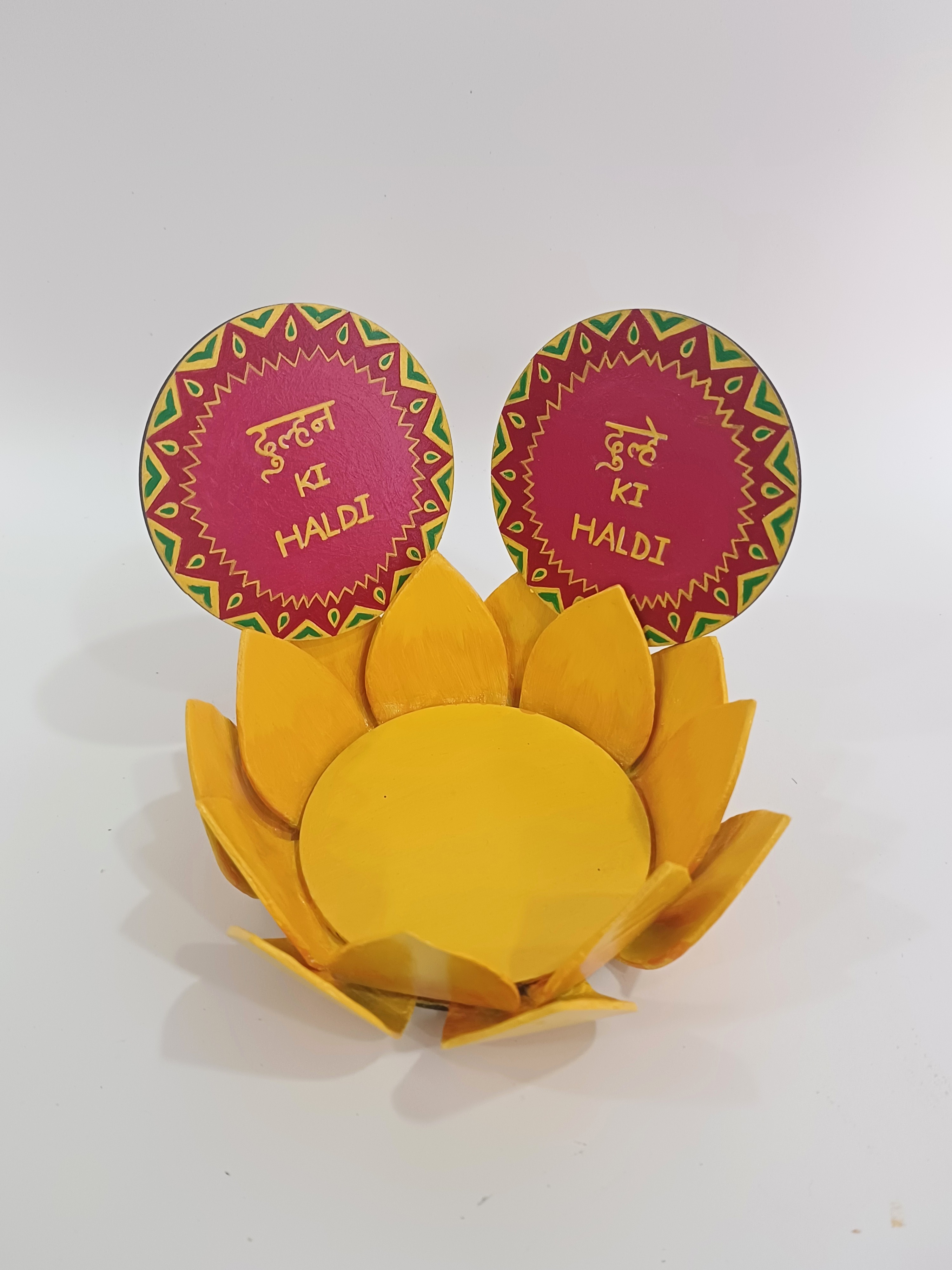 Create a beautiful, handcrafted lotus-shaped tray perfect for a Haldi ceremony during the wedding season. This project uses Fevicryl Mouldit to sculpt delicate lotus petals and combine them with vibrant, hand-painted MDF coasters, all arranged to hold a bowl of haldi in the center.