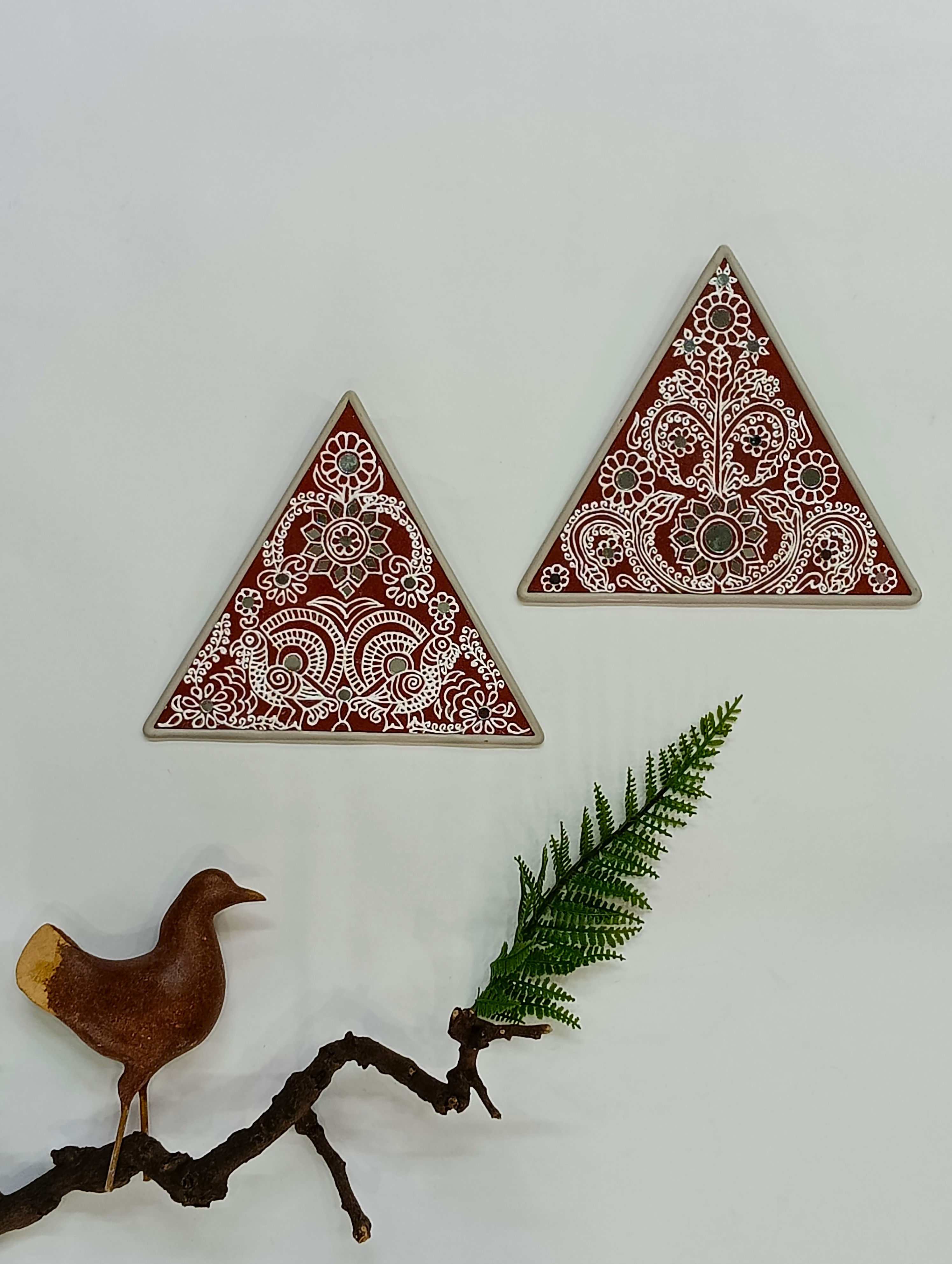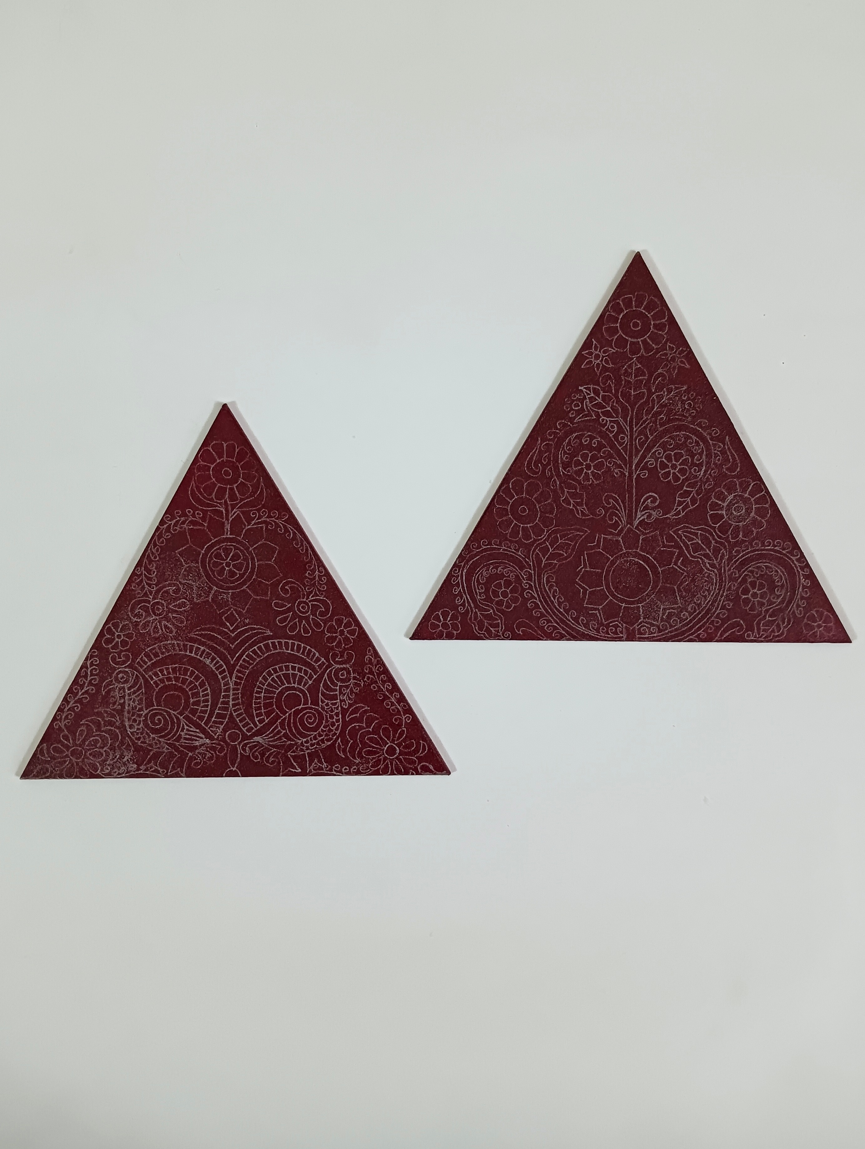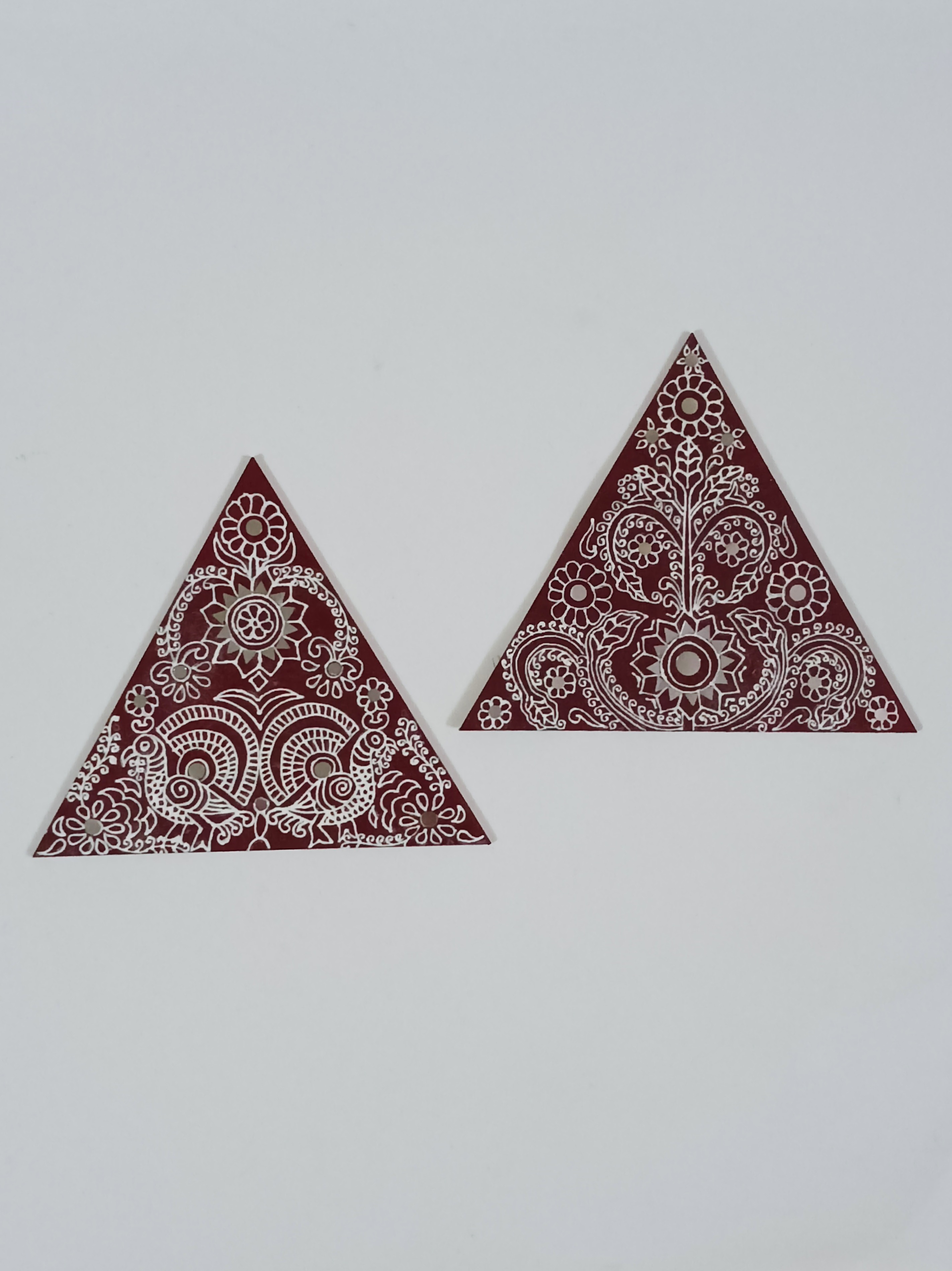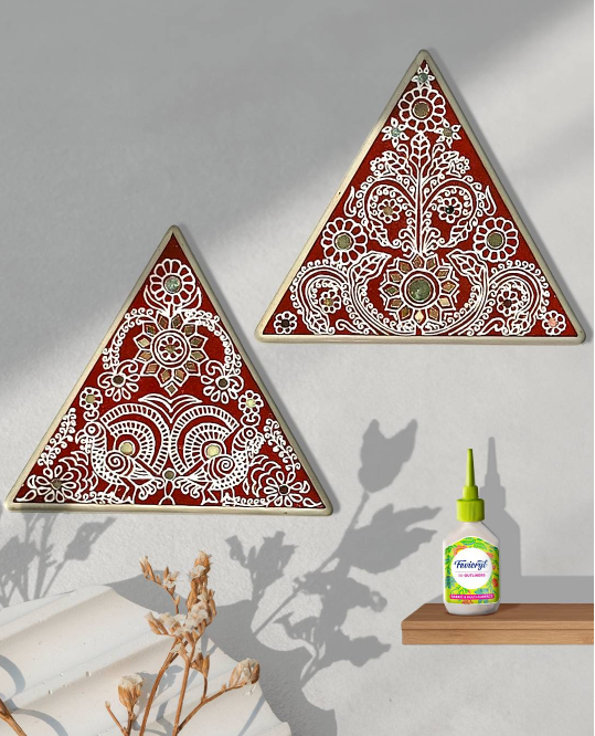 Make these beautiful triangles with Indian motif and Lippan art style using 3D outliner and mirrors, a good combination to add in your creative bag.