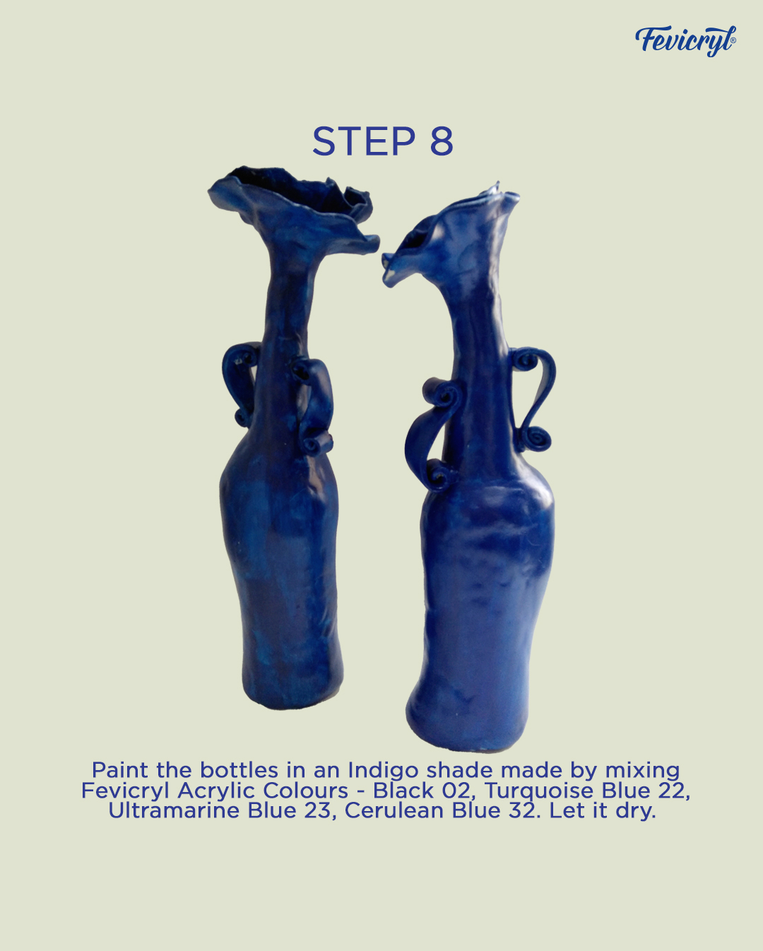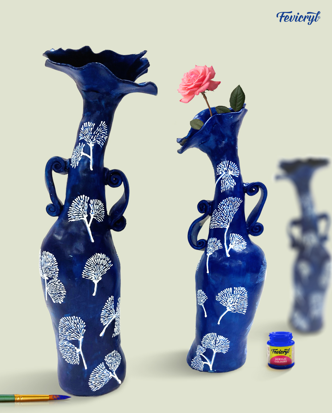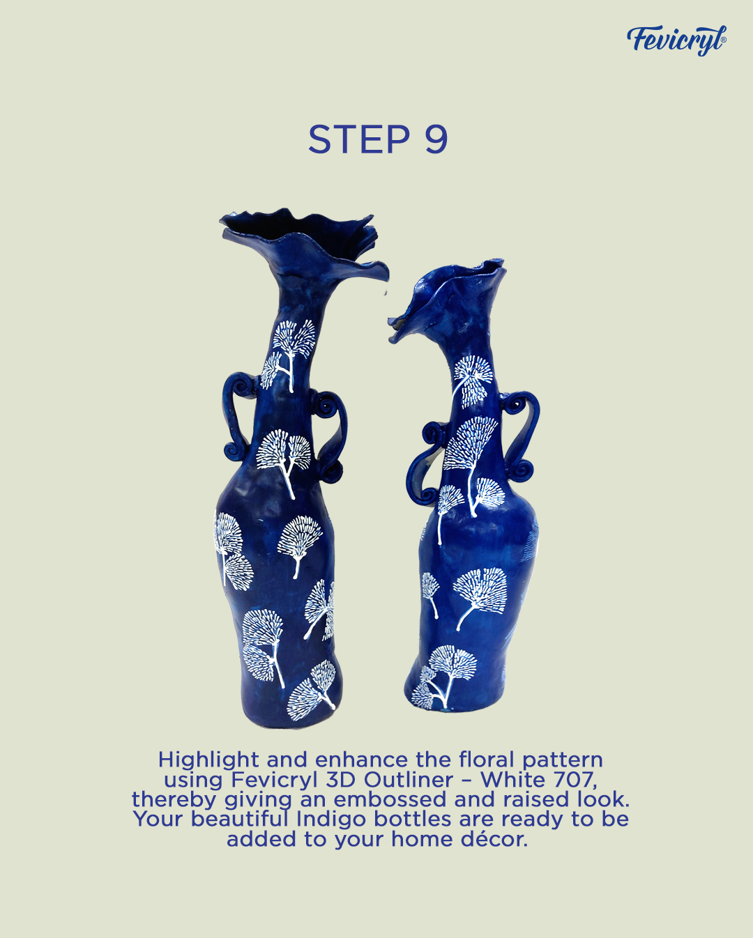 We’ve made bottle art super interesting with our DIY Indigo Bottle Vases made using Fevicryl Mouldit, Fevicryl Fabric Glue, Fevicryl 3D Outliner and Fevicryl Acrylic Colours.