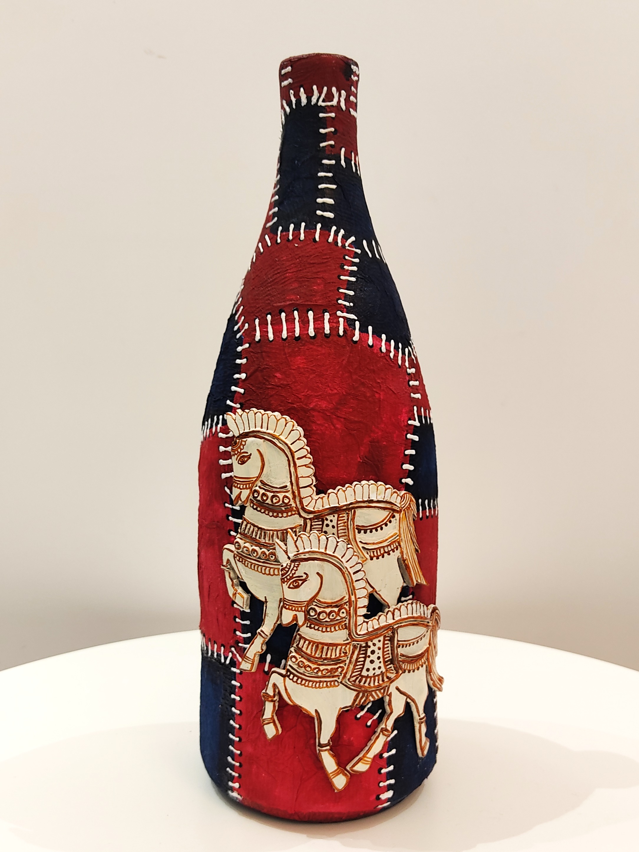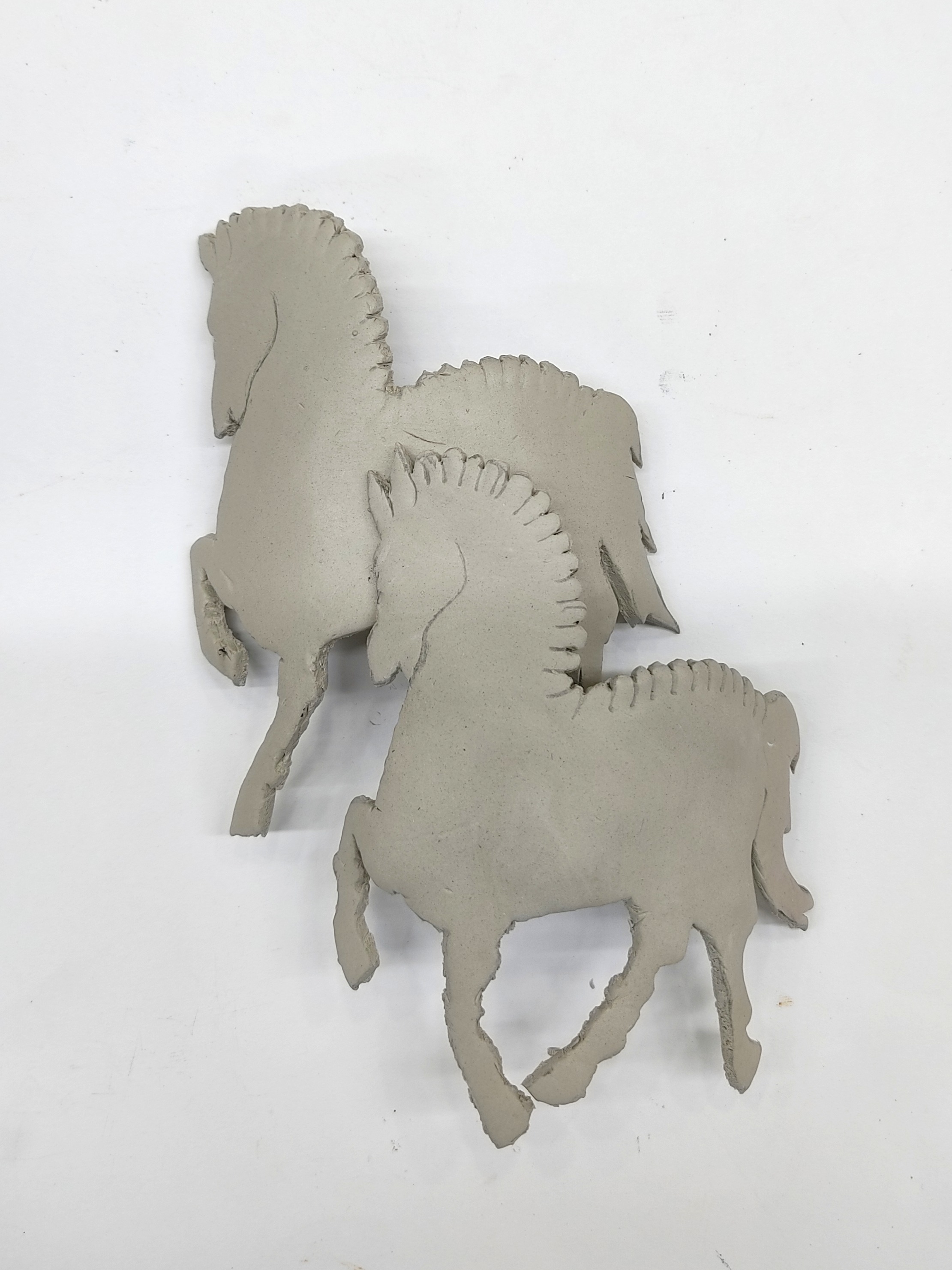 Take the clay slab, mark and cut out horses (2) from it, using clay carving and tools and a paper cutter for ease. Texture the mane of the horses as you see in the image above. Place these horses on the curvature of a bottle to get the desired shape.
