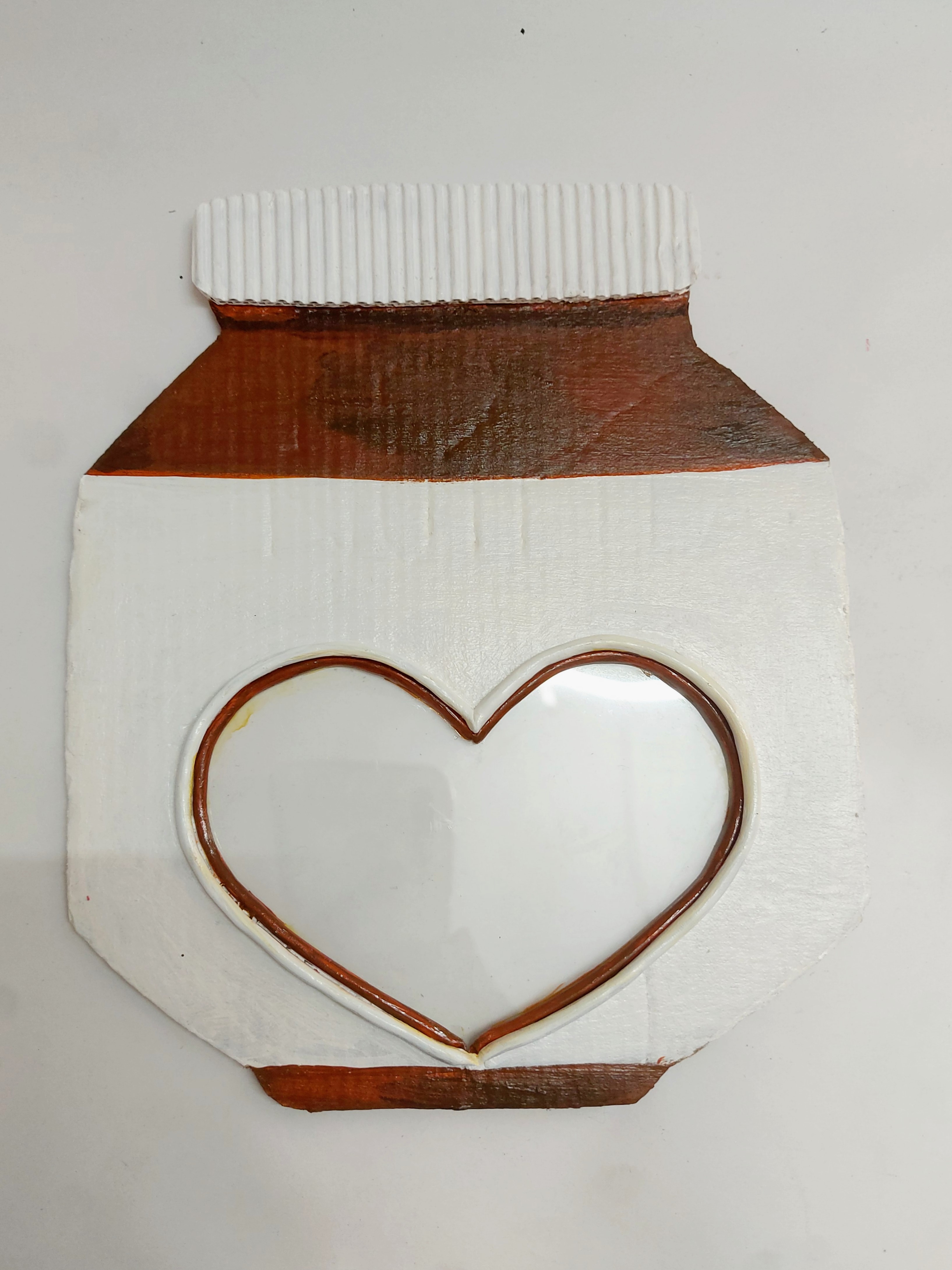 - Paint the jar with coil border heart to depict the actual jar of the Nutella using Acrylic Colours Burnt Sienna 01, Dark Brown 05 and White 27.