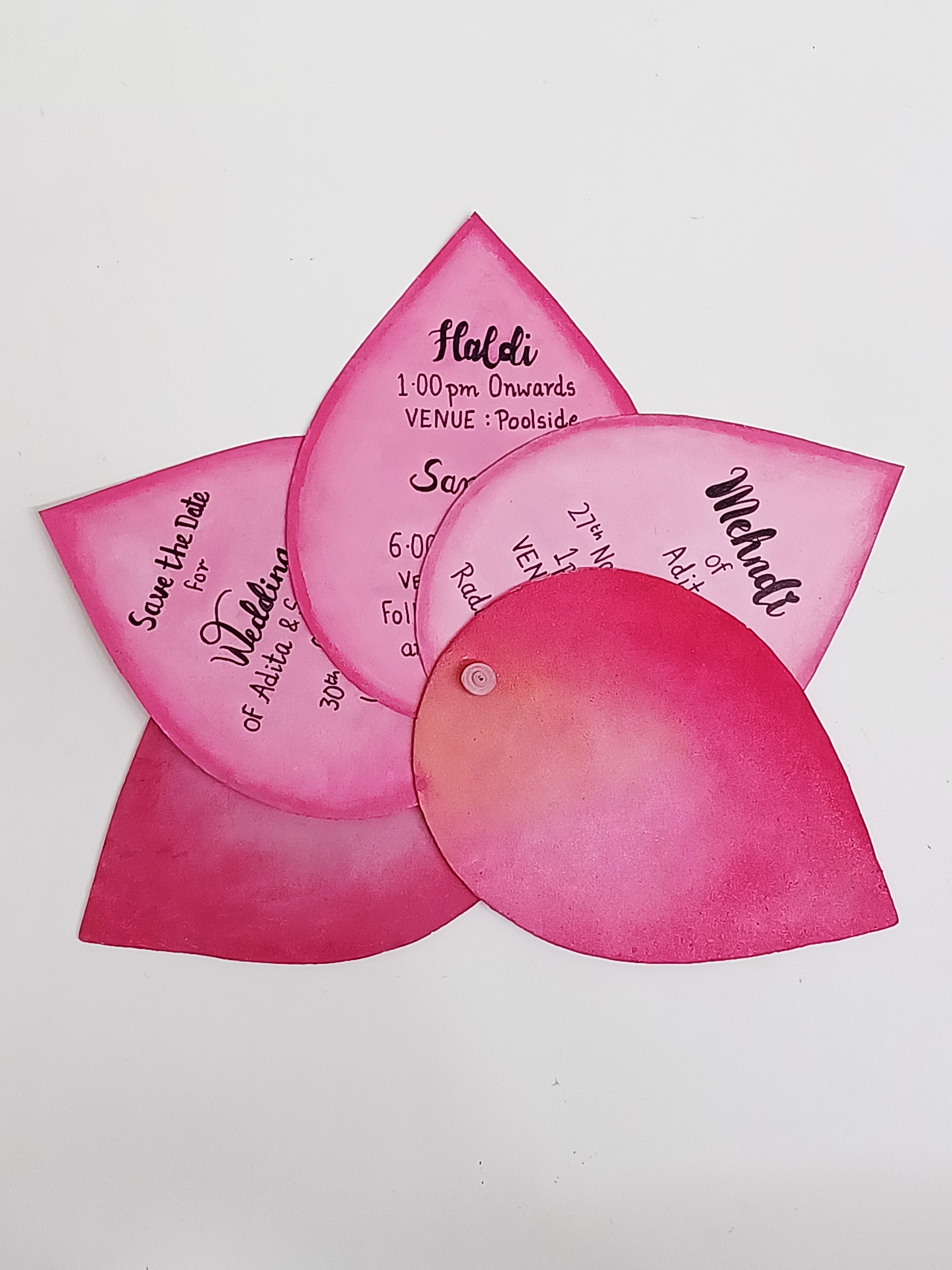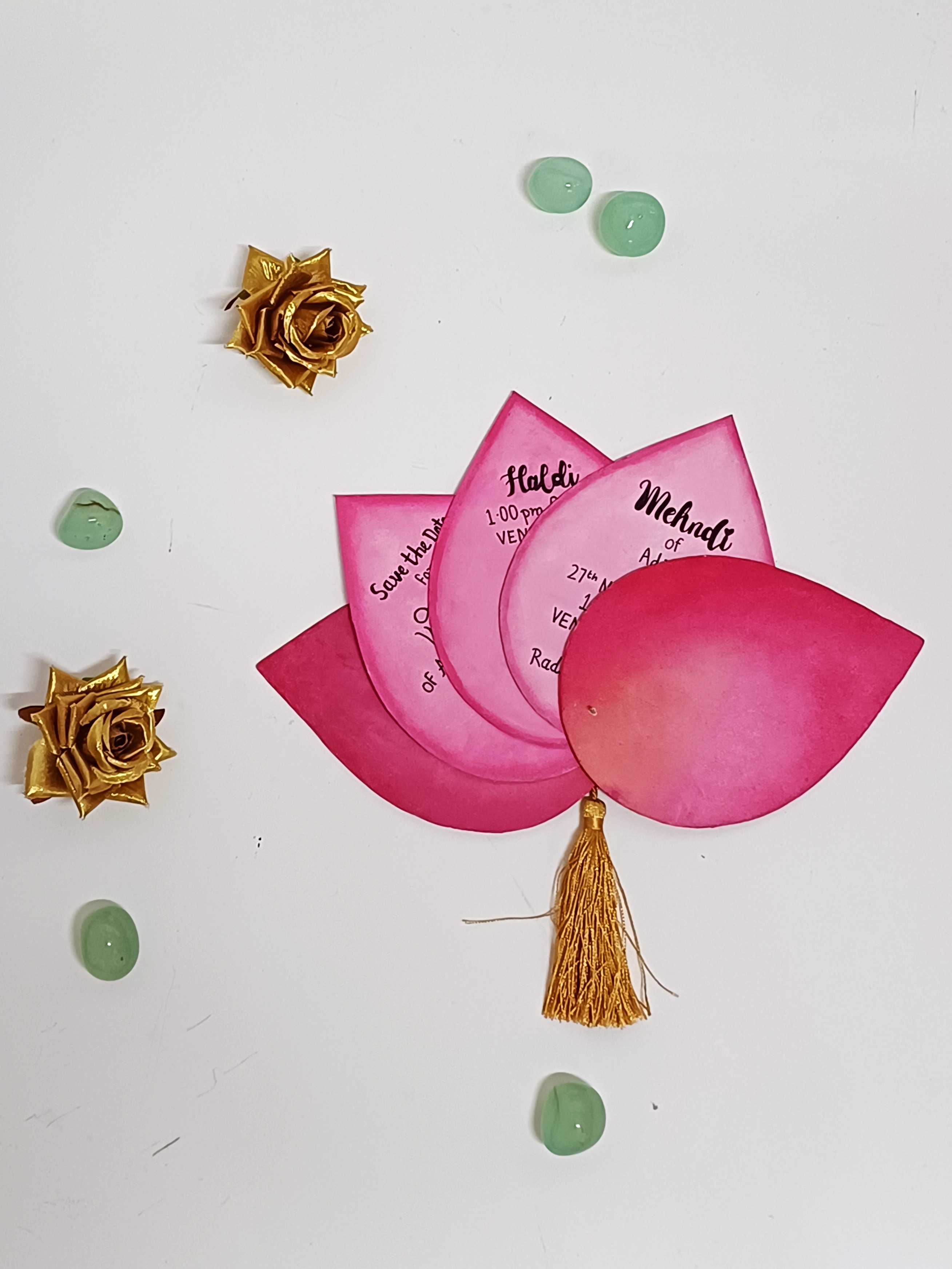 A beautifully handcrafted lotus-shaped wedding invitation, blending sculpted Mouldit clay petals with painted card paper layers. Each petal unfolds to reveal a unique celebration—Haldi, Mehendi, Sangeet, and the Wedding—making it a truly memorable and artistic keepsake.