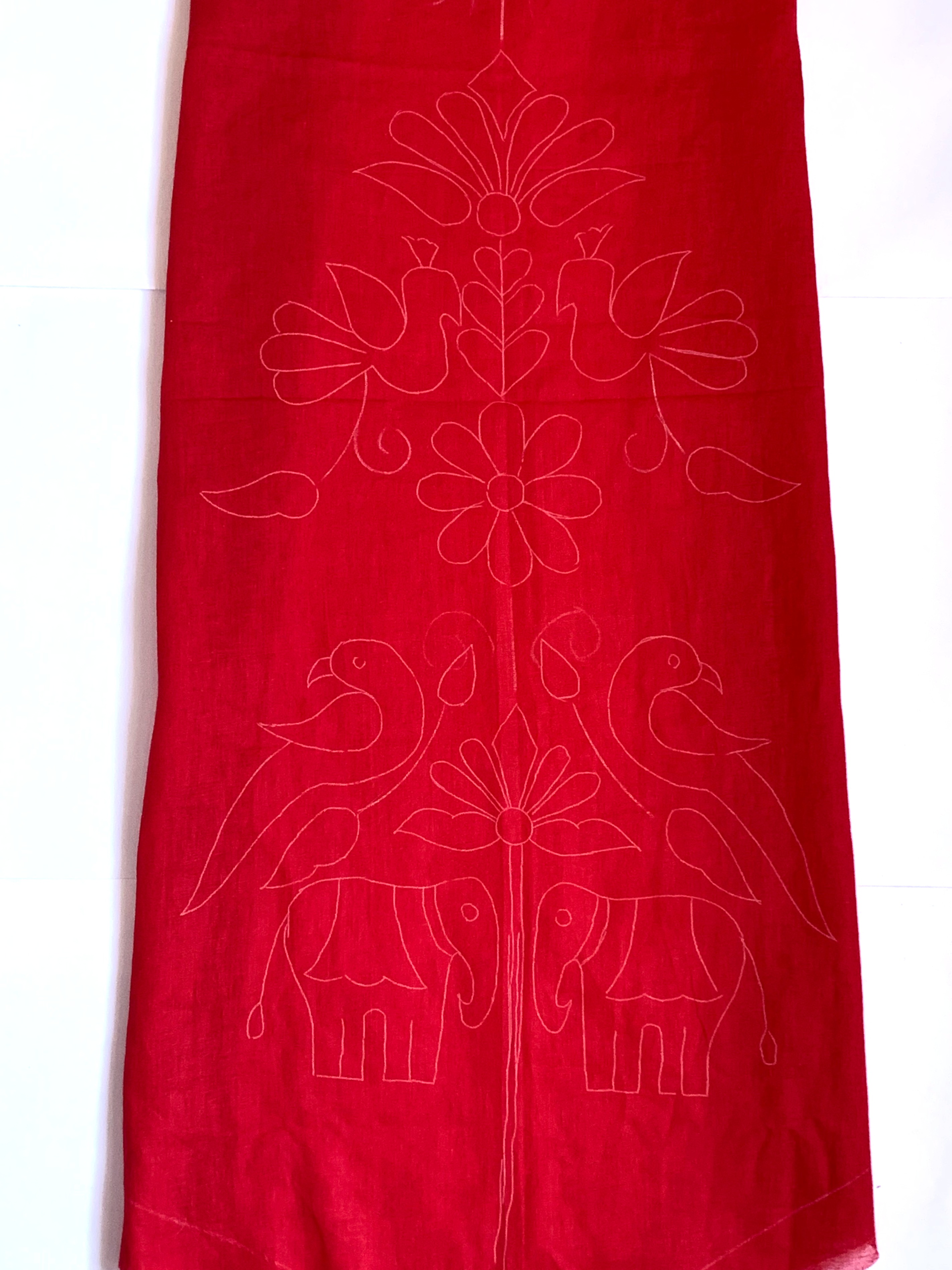 We are going to make the appliqué work table runner using the kutchi motifs from traditional aari work. We are replicating the chain stitch to decorate the runner. Take the red cotton fabric for the runner.