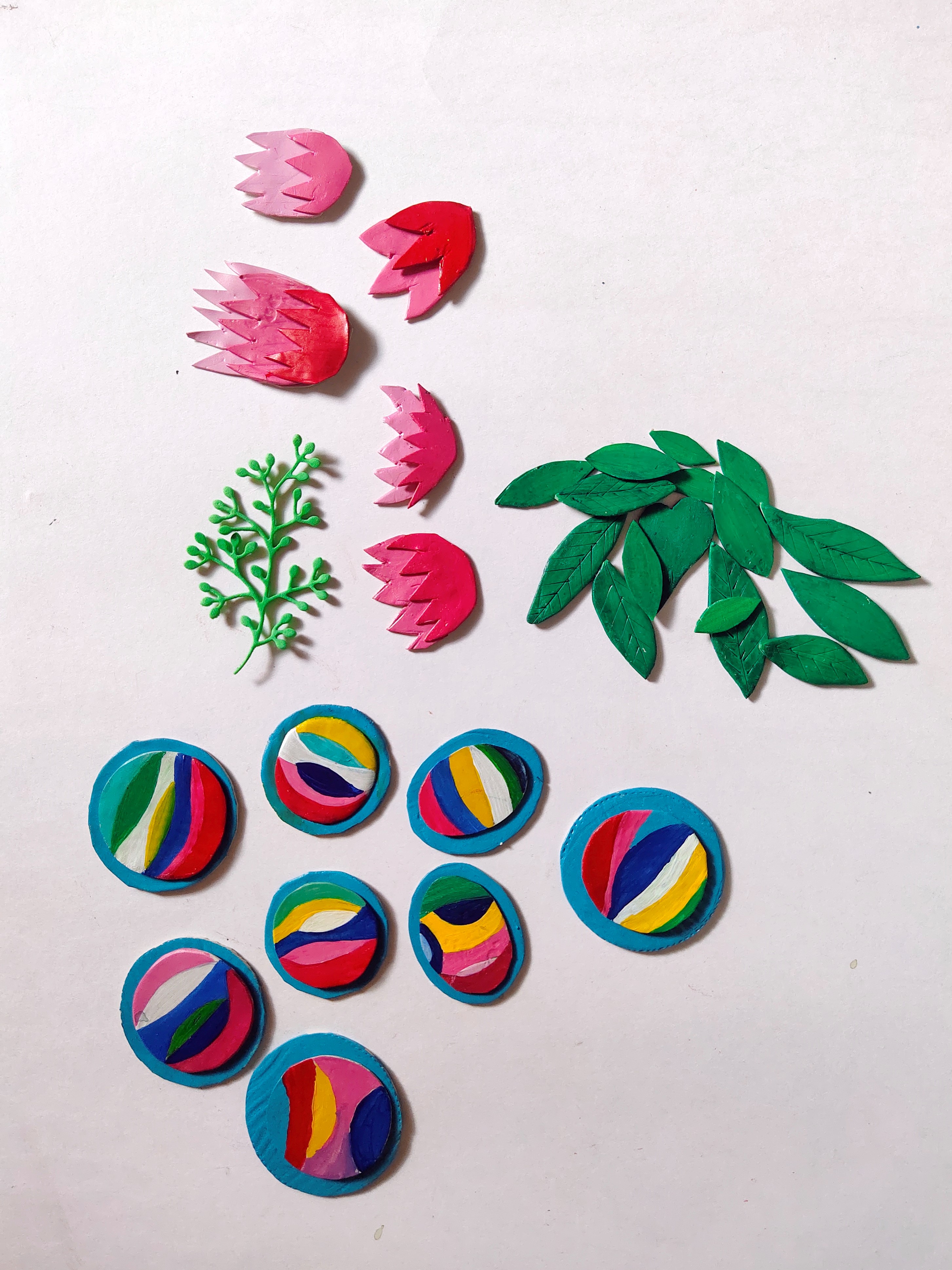 - Paint the circles, the leaves and the flowers with Acrylic Colours Chrome Yellow 03, Crimson 04, Dark Green 06, Ultramarine Blue 23, White 27, Cerulean Blue 32, Leaf Green 62, Sky Blue 63 and Teal Blue 68.
