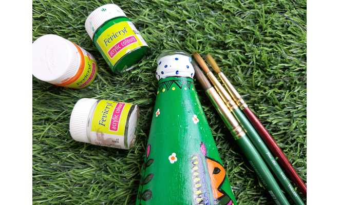 Fevicryl Acrylic Colours, Fevicryl Modge Podge, Fine Art Brush, Empty glass bottle