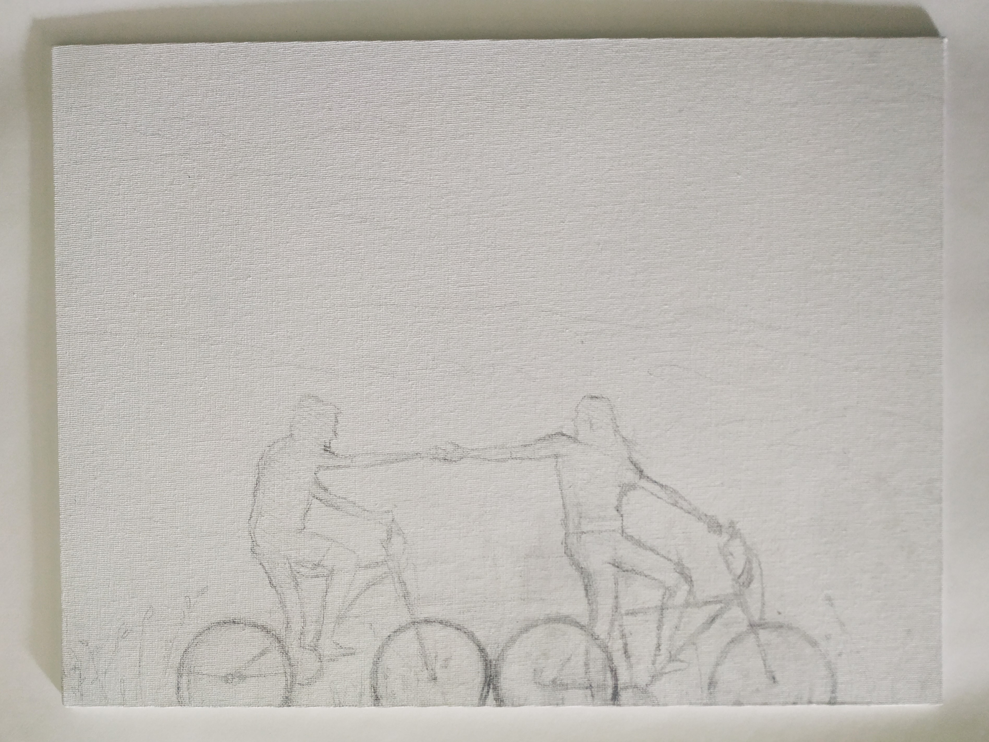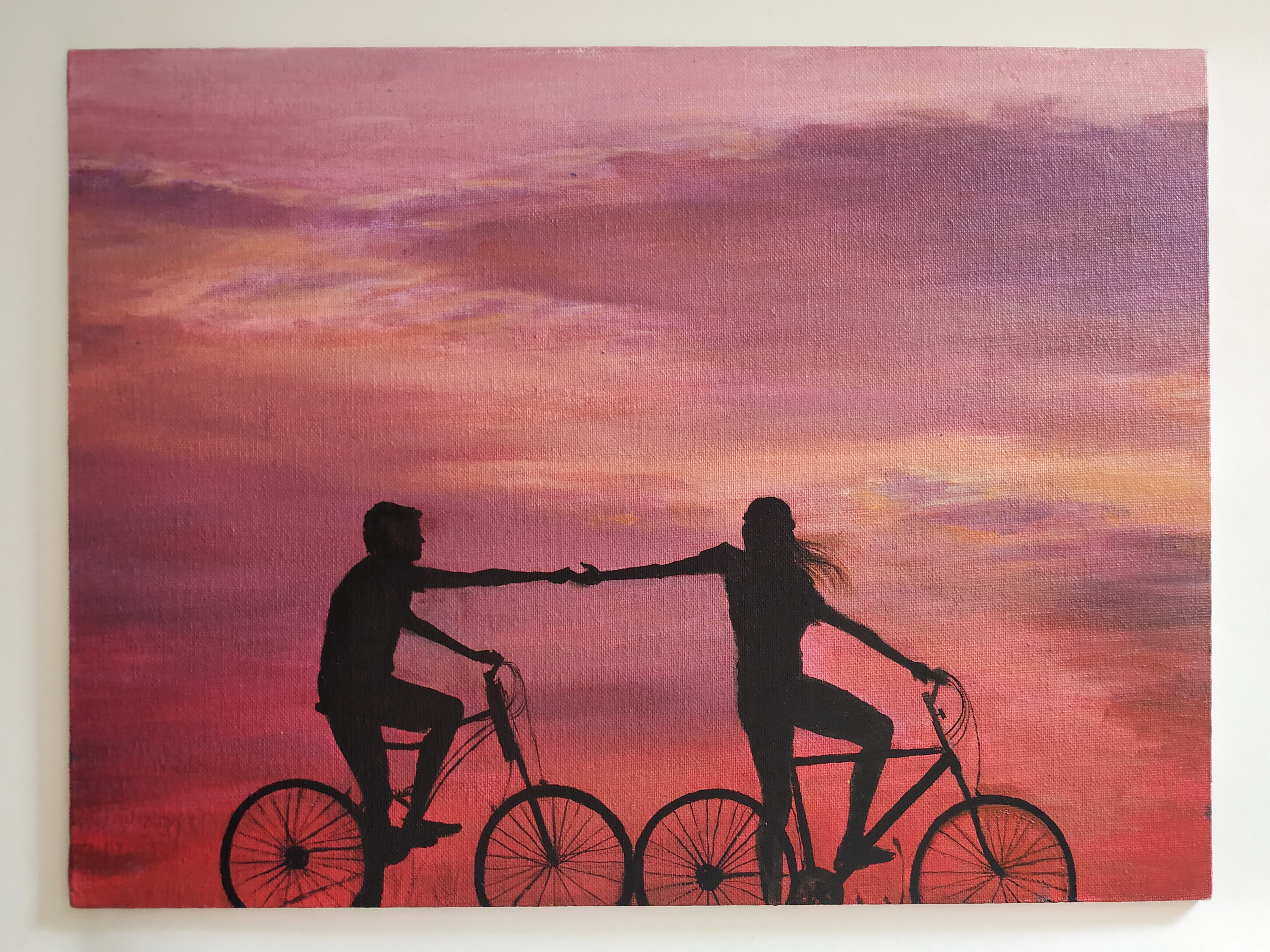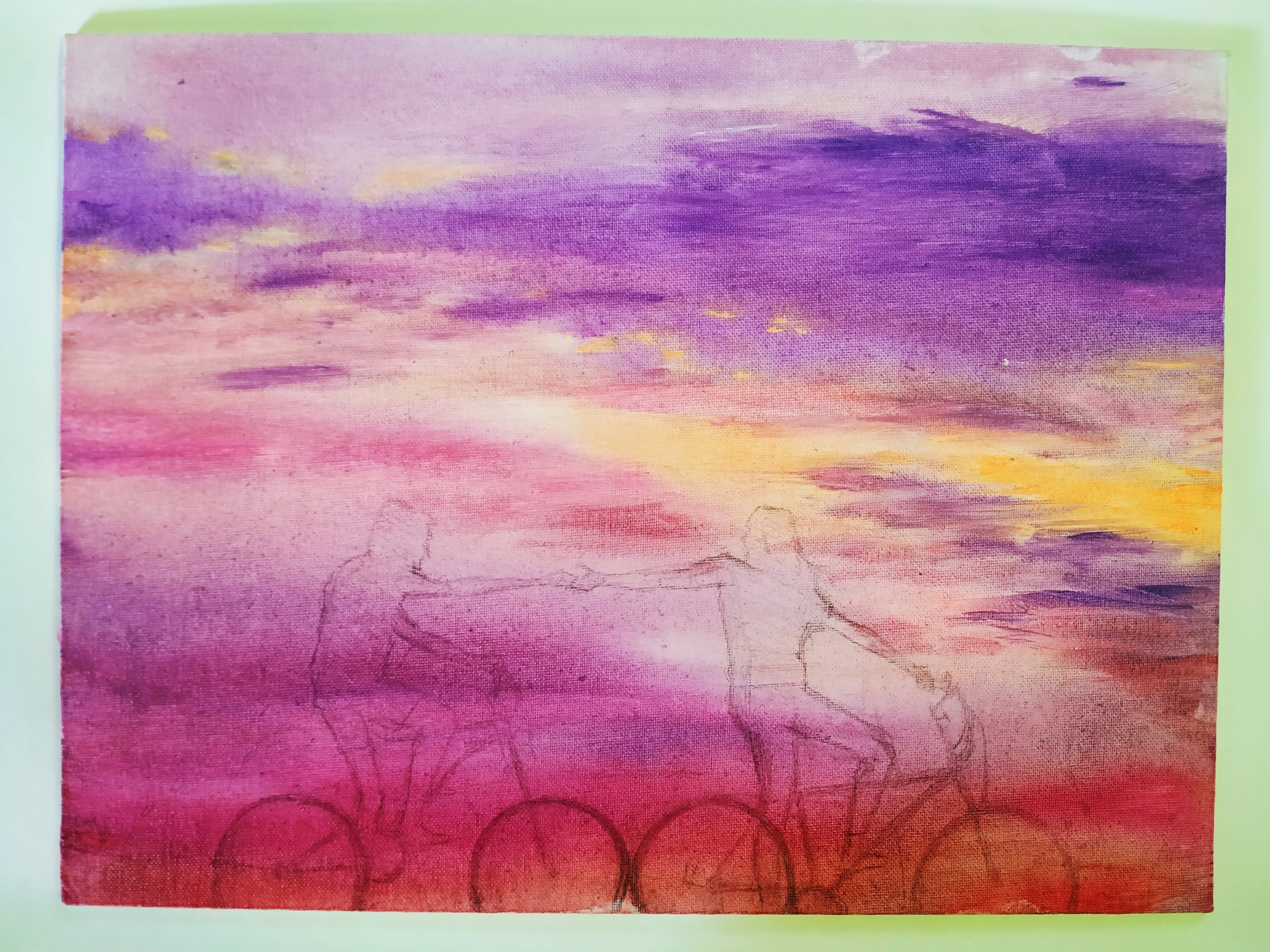 - Paint the figures and the bicycles in black silhouette, the background using Acrylic Colours Black 02, Chrome Yellow 03, Crimson 04, Orange 17, Pink 18, Violet 25, White 27 Salmon Pink 65 and little amount of Neon Pink 018.