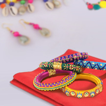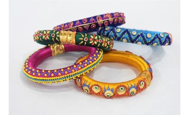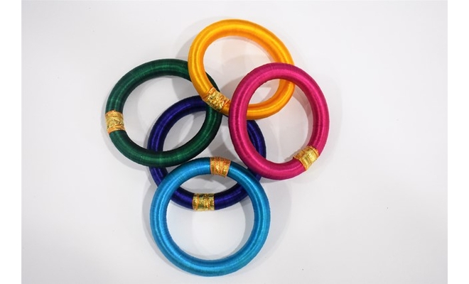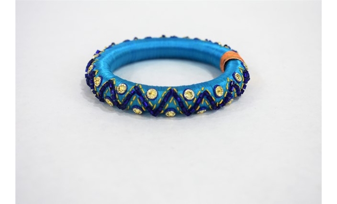 Fevicryl 3D Outliner Red 701, Fevicryl 3 D Outliner Pearl Blue 305, Fevicryl 3 D Outliner Pearl Metallic Gold 352, Fevicryl Fabric Glue, Bangles with Silk Thread, Ornamental Stones, Zardozi Thread, Colourful Beads, Glass beads, Gotta Patti (Round Shaped), Cut Dana (Blue Colour), Toothpick, Scissors.