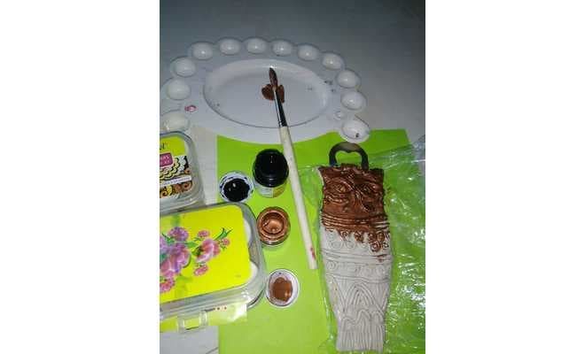 Then finally the next day after it dries on both the sides, paint the features with Fevicryl Pearl Metallic Colours and with Fevicryl Acrylic Black colour, take small portion and mix with the metallic copper and give the same shade and let it dry.