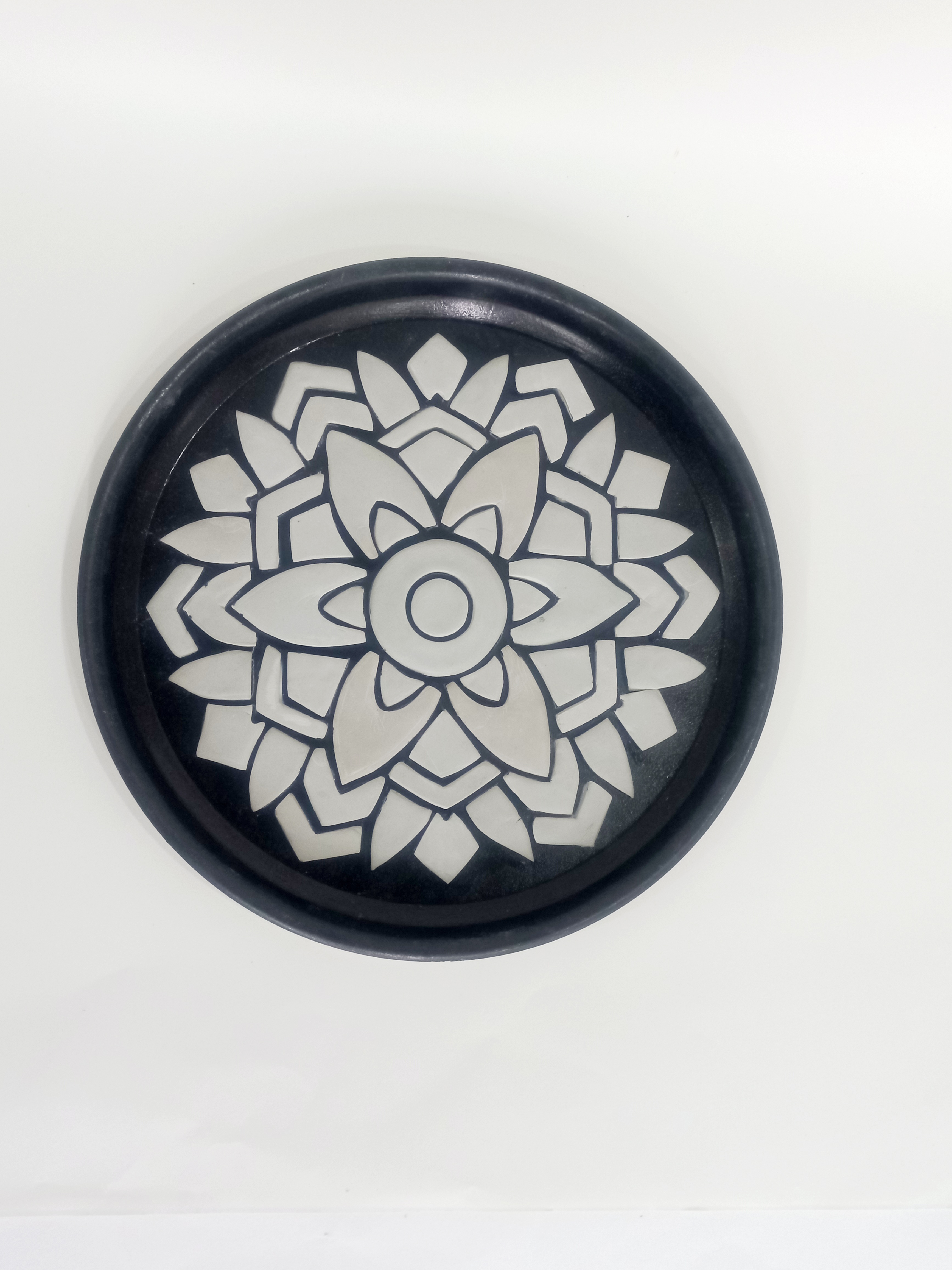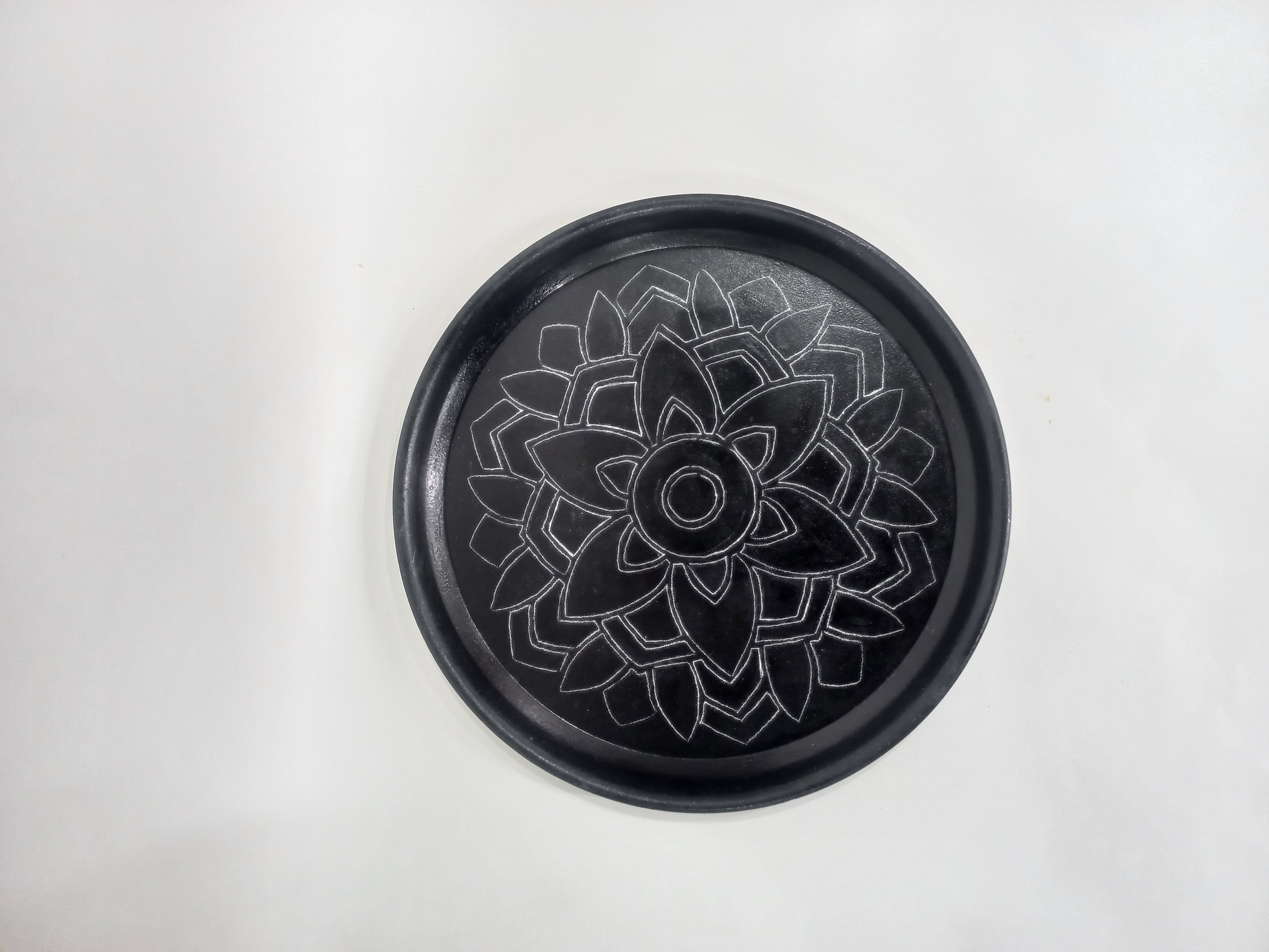 - Once the black paint is dry, use a pencil and tracing paper to carefully sketch your desired design in the center of the thali.