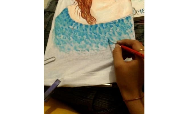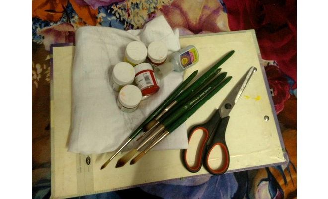 Fevicryl Soft Acrylic Colours Black 202, Chrome Yellow 203, Crimson 204, Dark Brown 205, Dark Green 206, Golden Yellow 209, Pink 218, Prussian Blue 219, White 227, Sky Blue 263, Flesh Tint 230, Liquid Embroidery Glitters Aqua Blue 416, Silver 402, Fine Art Brush, Colour Palette, Scissor, Hard Board.