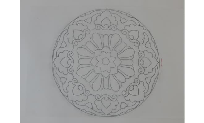 Trace the rangoli design on the painted placemat using white carbon paper.