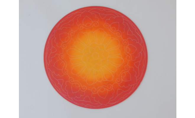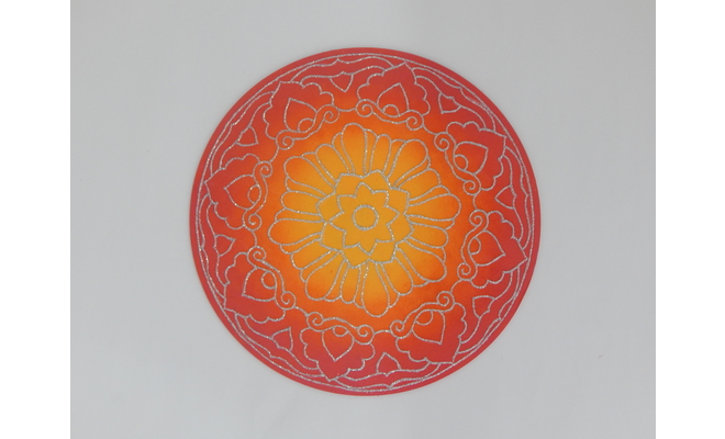 Fevicryl Acrylic Colours - Chrome Yellow 03, Orange 17, Pink 18, Fevicryl Liquid Embroidery Glitter - Silver 402, Fevicryl Fabric Glue, Fine Art Brushes, Round MDF Placemat, Water Container, Colour Palette, Pencil, White Carbon Paper, A3 Sized White Paper, Ornamental Stones (Green Teardrop Shaped and Orange Round Shaped), Small Round Shaped Mirrors.