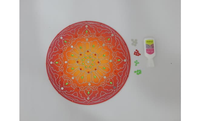 Decorate the rangoli design by sticking few green teardrop shaped and orange round shaped ornamental stones as well as few small sized sound mirrors with Fabric Glue.