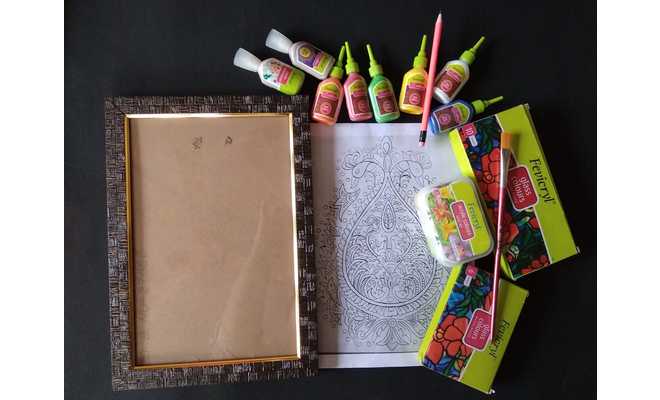 First you have to arrange art supplies needed for this. Here I'm using fevicryl 3D Outliners, Black Acrylic colours, printout of a design you want to make and frame( I already have this frame so that I am going to do on it) . You can use any glass base or also you can use OHP sheet for this.