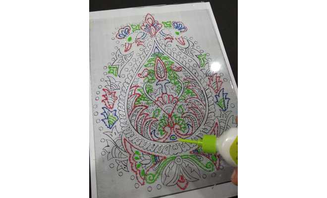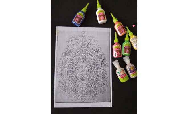 As you can see in picture, trace your design on a glass/OHP sheet with liners. Colour combination is upto you.