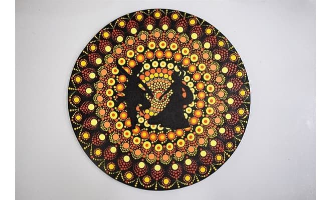 • Paint the radiating circular design in pointillism style using shades of yellow and orange with Acrylic Colours Black 02, Chrome Yellow 03, Crimson 04, Lemon Yellow 11, Orange 17 and White 27 and pointillism tools.