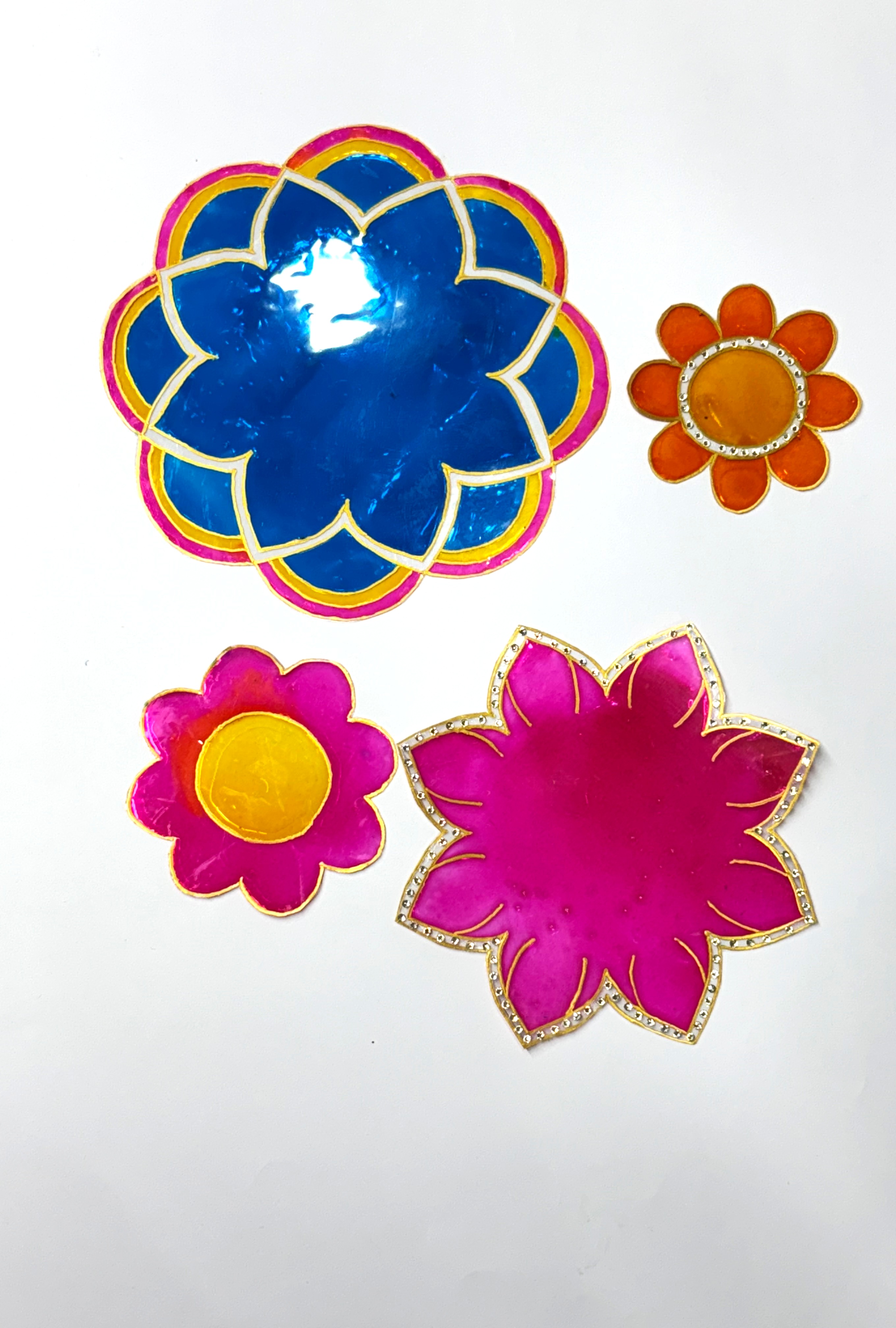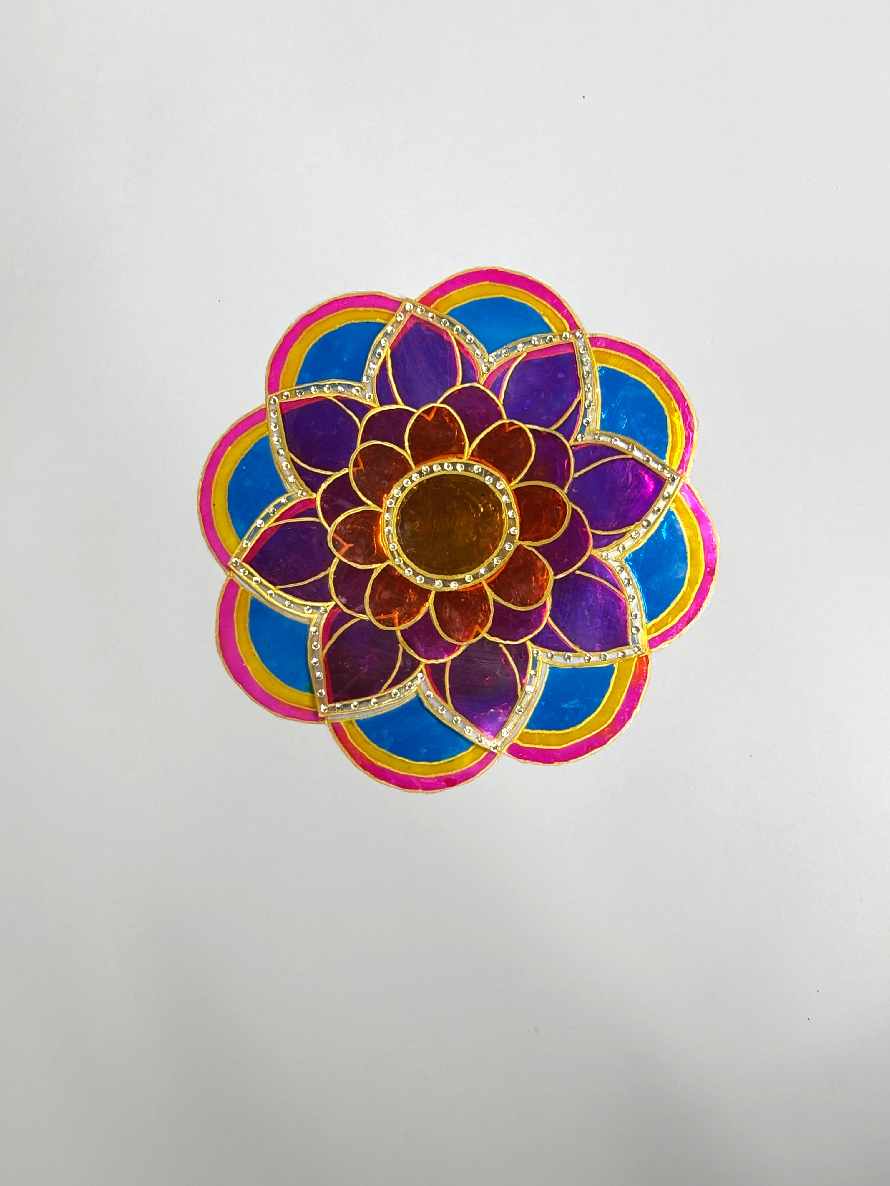 - After all the colours have dried completely, use scissors to carefully cut out the different shapes of your rangoli design.