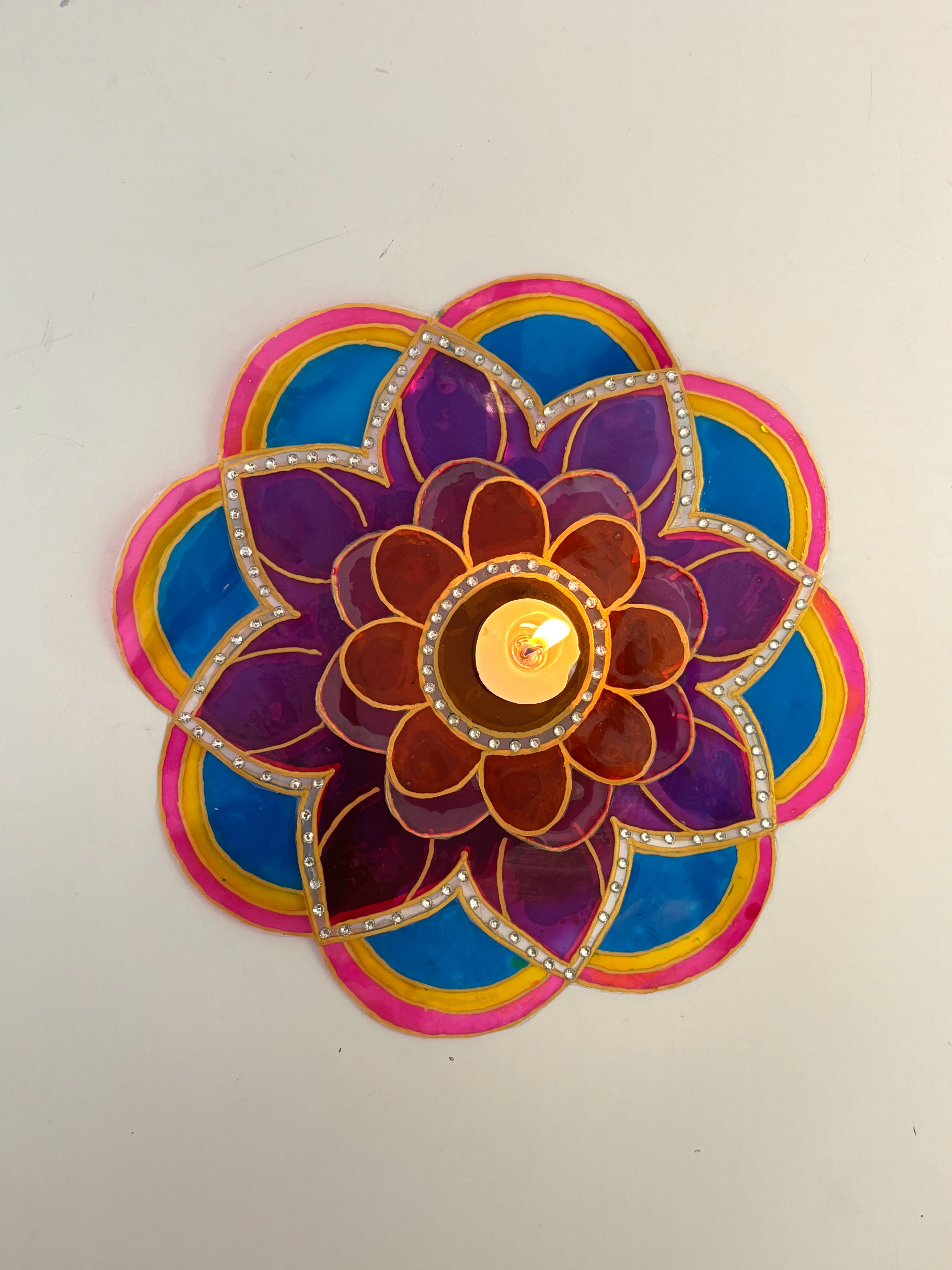 Bring the festive spirit of Diwali to your home with a beautiful, reusable rangoli! This project uses transparent glass colours and a pearl metallic outliner on an OHP sheet to create a stunning design that can be used year after year. It's a fun and easy way to add a pop of colour and traditional art to your celebrations.