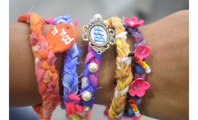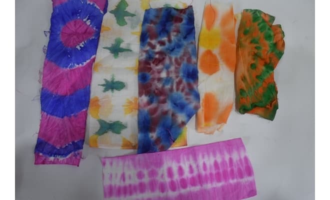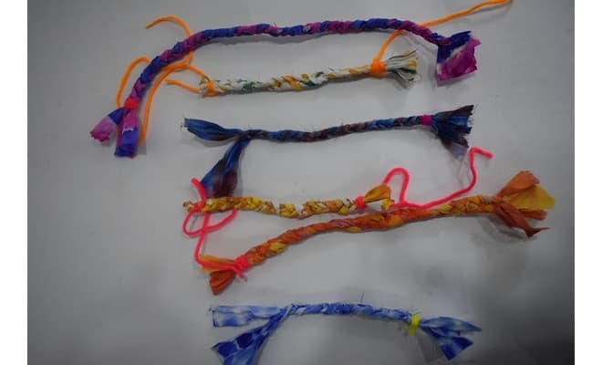 Take any colourful tie and dye fabric pieces to make friendship bands