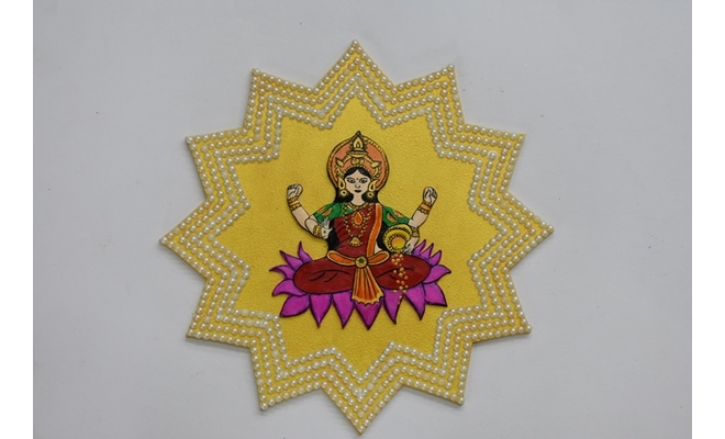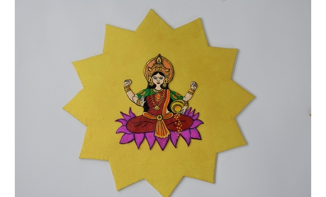 • Paint small lotus flowers in the hand of Goddess Laxmi’s with Acrylic Colours Light Green 12 and Deep Brilliant Purple 64.