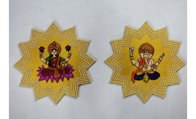 • Paint lord Ganesha and the goddess Laxmi cutouts using Acrylic Colours Black 02, Chrome Yellow 03, Crimson 04, Light Green 12, Orange 17, Violet 25, White 27, Flesh Tint 30, Deep Brilliant Purple 64, Pearl Metallic Silver 351 and Gold 352.