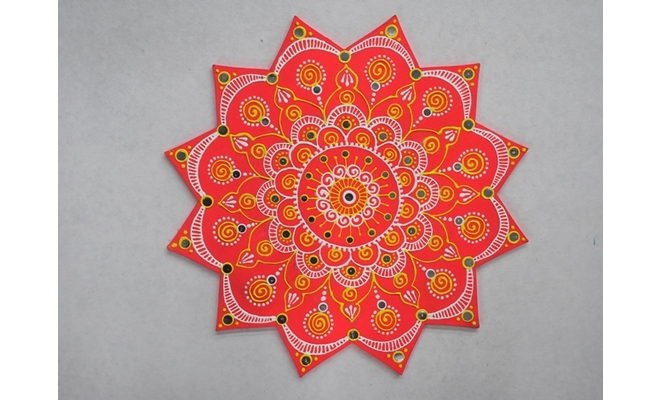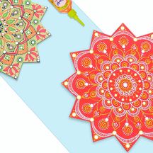 Fevicryl Acrylic Colour White 27, Neon Pink 018, Fevicryl 3D Outliner Yellow 703, White 707, Fevicryl Fabric Glue, Fine Art Brushes, MDF Wooden Cutout Rangoli, Sponge, White Pencil, Foil Mirrors, Colour Palette, Water Container.