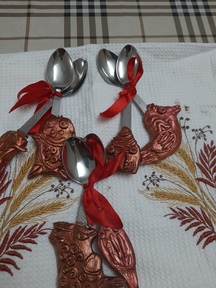 Steel spoons, Fevicryl Mouldit, Fevicryl Pearl Metallic Colours, Fevicryl Acrylic Colour Black,Fine Art Brush, Cardboard Fevicol, Pencil, Scissors.