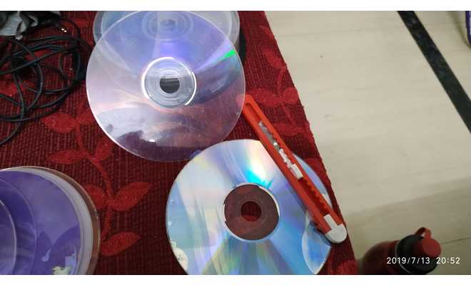 Fevicryl Water Based Glass Colours, Fevicryl 3D Outliners, Old DVD, Cutter, Pearls, Threads for hanging.