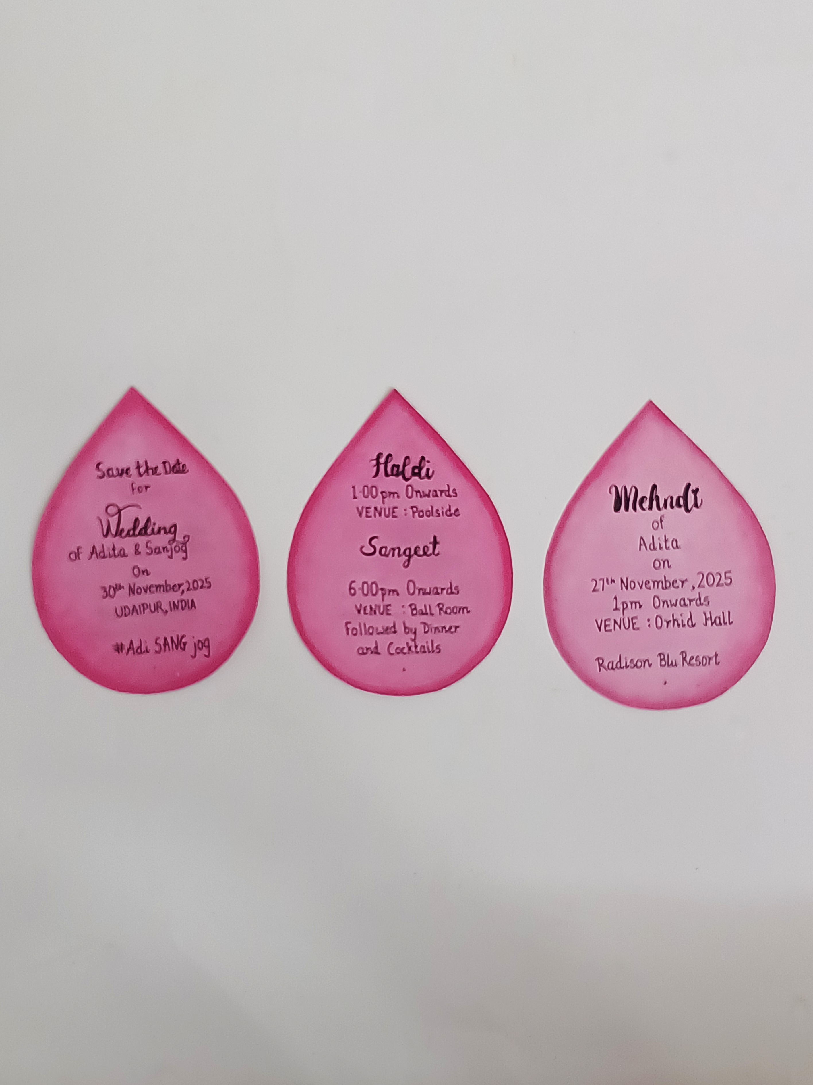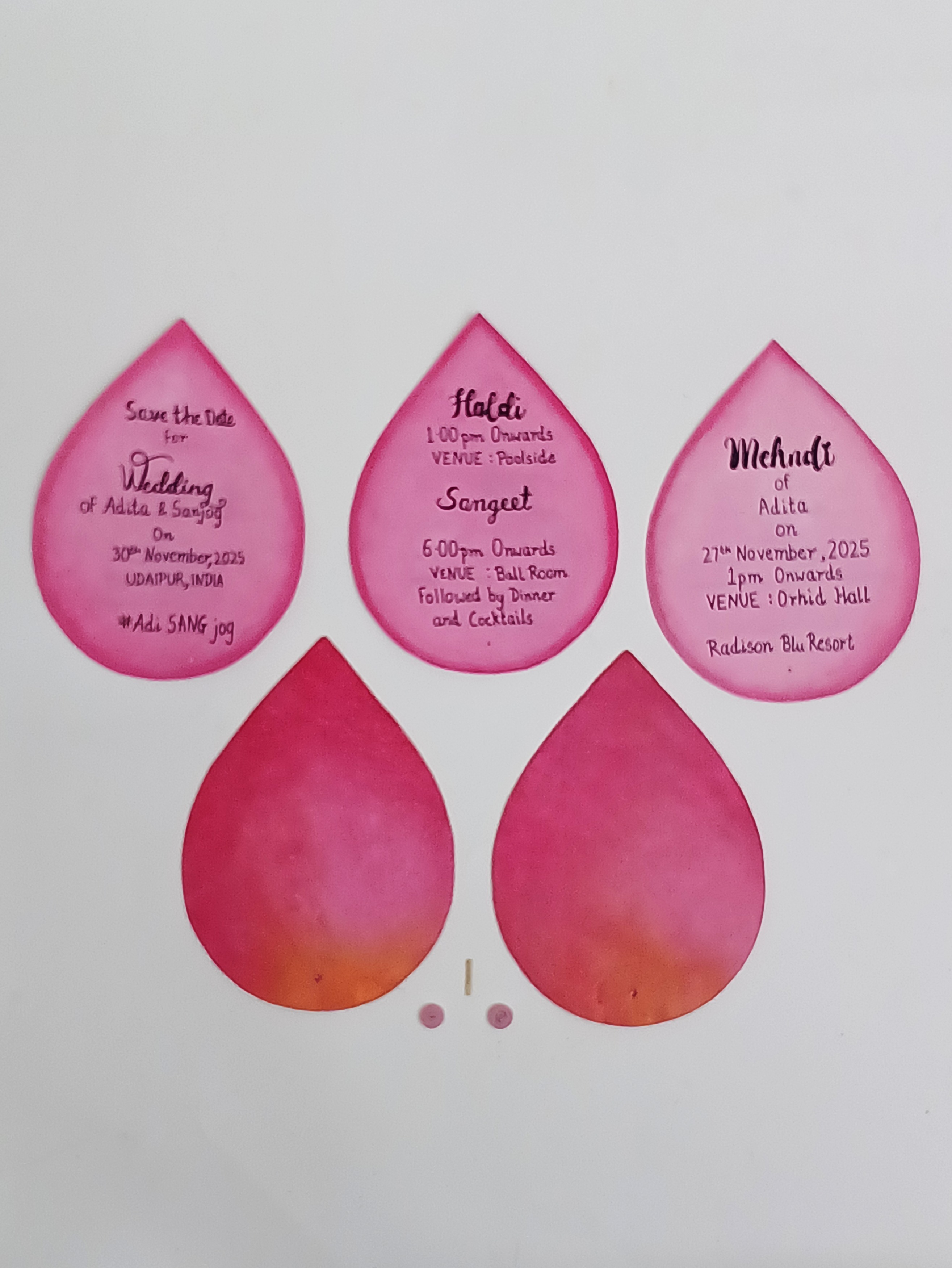 A beautifully handcrafted lotus-shaped wedding invitation, blending sculpted Mouldit clay petals with painted card paper layers. Each petal unfolds to reveal a unique celebration—Haldi, Mehendi, Sangeet, and the Wedding—making it a truly memorable and artistic keepsake.