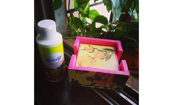 Fevicryl Modge Podge, Fevicryl Acrylic Colours, Fine Art Brush, Mdf bases, Decoupage tissue.