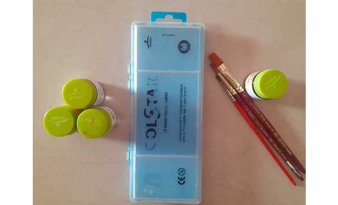 Fevicryl Acrylic Colours, Empty box, Watercolour, Fine Art Brush (Flat and Round).